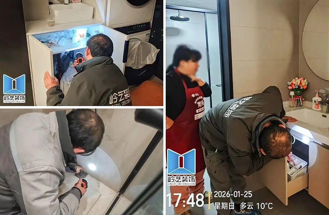 在与张阿姨因装修结缘的12年间,张阿姨介绍了6位自己的亲朋好友到岭艺装修,一走进张阿姨家,回访团队就主动询问家中家居使用情况,细心的江工发现卫生间水龙头有轻微滴水现象,便立刻提出帮忙检查维修。
