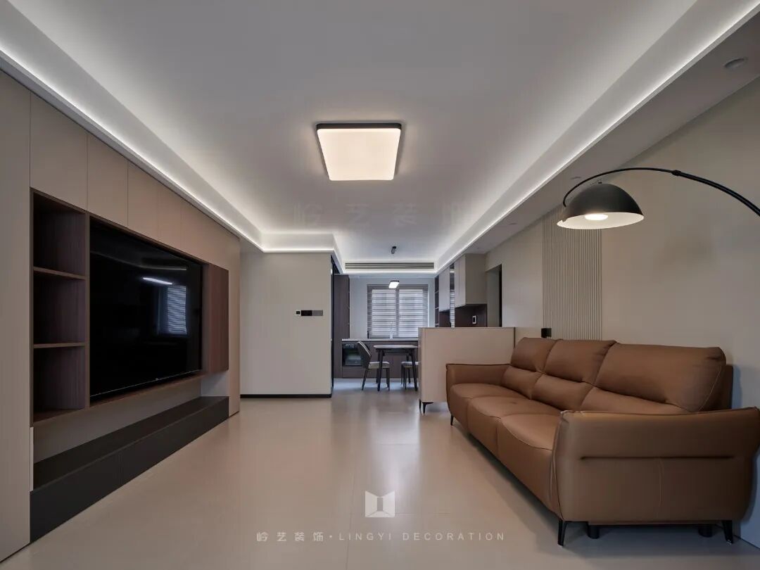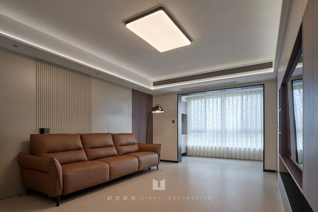 沙发背景墙采用了格栅与木饰面拼接设计,简约而不失格调,瞬间提升了客厅的档次。再加上加装的筒灯,在夜晚灯光亮起时,营造出温馨舒适的氛围,让一家人可以尽情享受休闲时光。