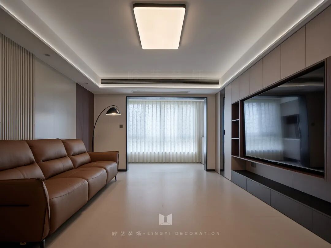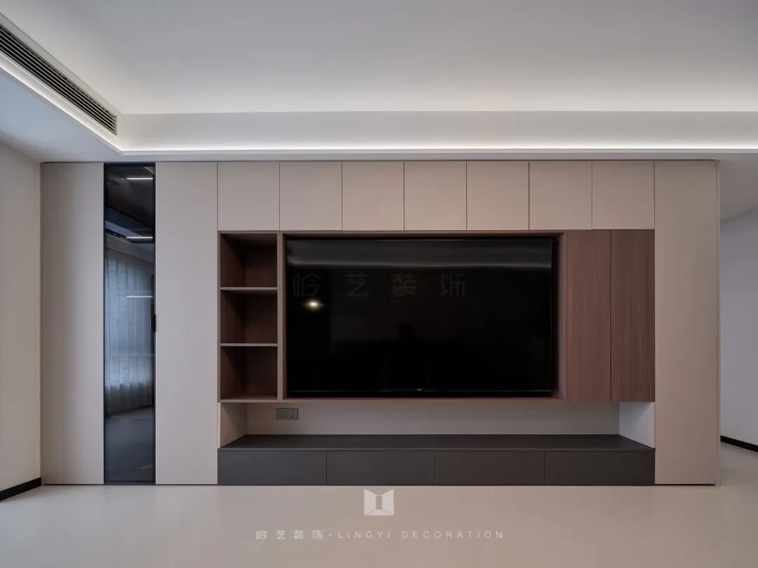 客厅是一家人休闲娱乐的主要场所,也是接待客人的门面担当。设计师在这里做了一整排电视柜,它就像一个巨大的收纳神器,能够满足大量的储物需求,无论是孩子的玩具、书籍,还是一家人的影碟、杂物,都能轻松藏于其中。
