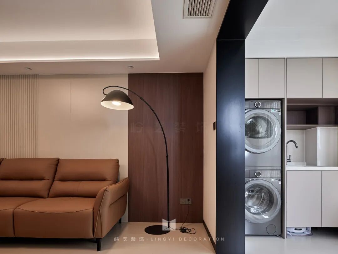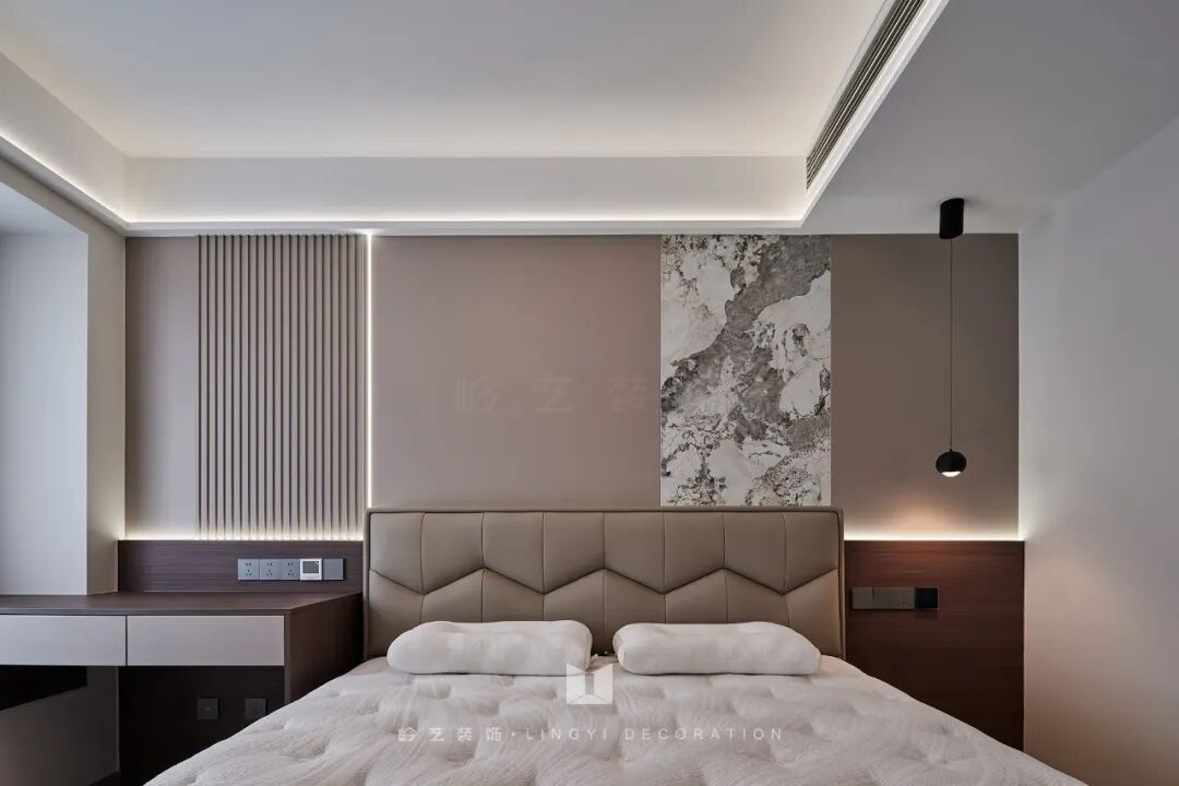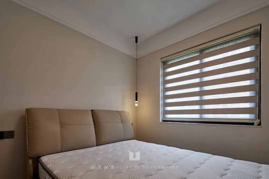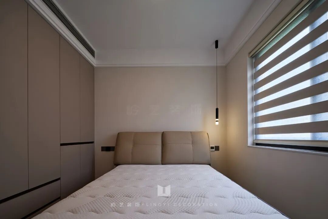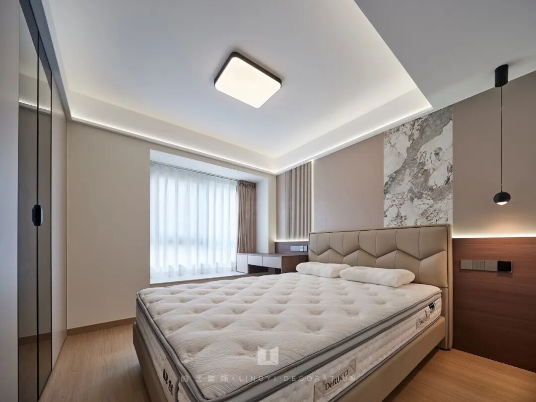 主卧作为主人的私密空间,设计上更加注重舒适性与功能性。一进门处,便是“次净衣区” 。让你第二天还要穿的外套,有了一个临时存放的地方,再也不用担心它和干净的衣物混放,保持了衣柜的整洁有序,过渡非常实用。