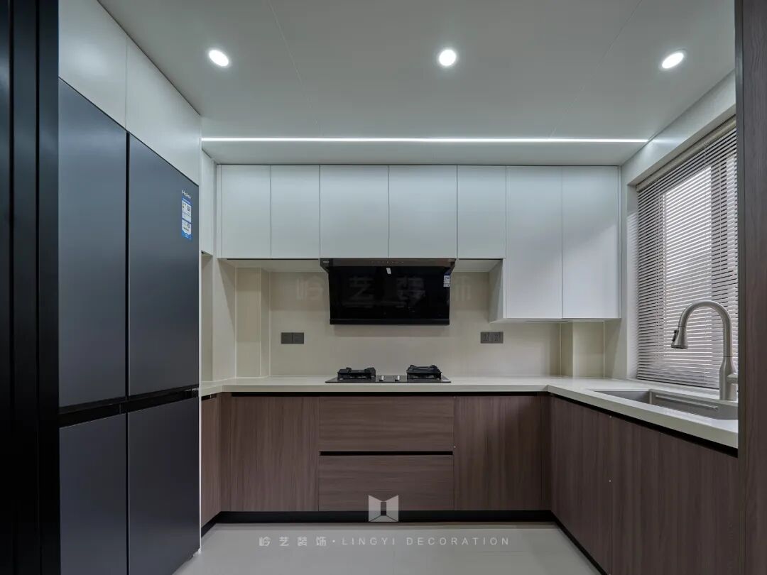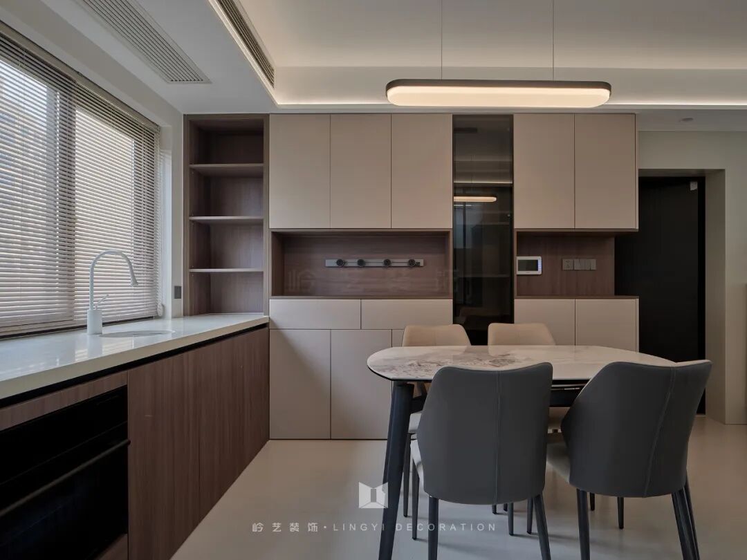 原本面积狭小的厨房,还得放置冰箱,导致台面空间捉襟见肘。于是,设计师大胆地将厨房台面向外延伸,与餐边柜区域完美衔接,瞬间扩大了操作空间。