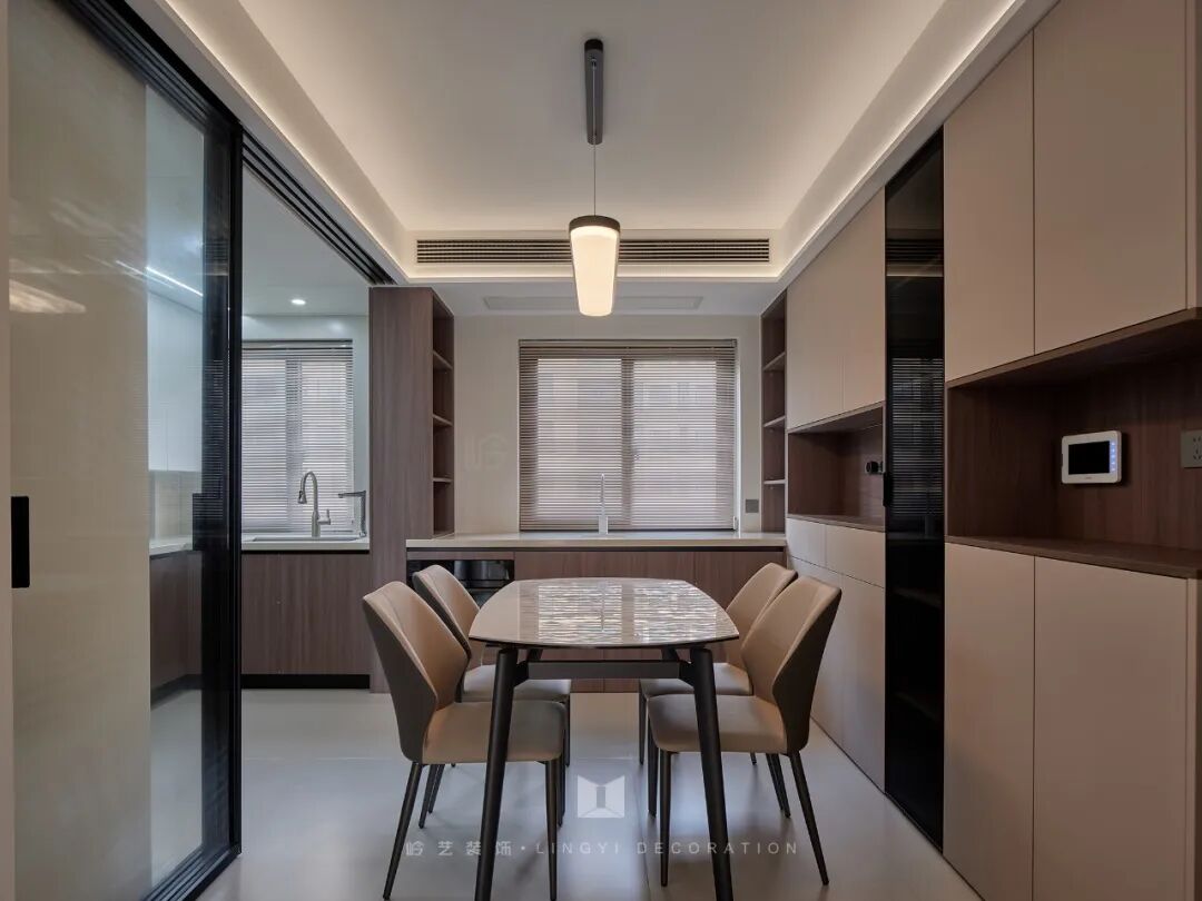 在厨房门的设计上,采用了推拉门结构,当门打开时,厨房与餐厅形成一个开放式的空间,视野开阔,家人之间的互动也更加便捷;当门关闭时,又能有效阻隔厨房的油烟,保持其他空间的清洁。