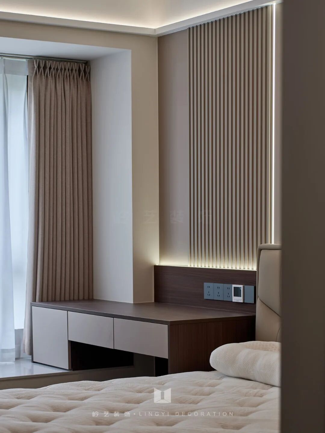 卧室里的飘窗也被充分利用起来,设计师通过巧妙的设计扩展了储物空间。不仅加深了抽屉,大大增加了收纳量,还将梳妆台与背景墙进行了一体化设计。从颜色到材质,都做到了统一,从视觉上看,梳妆台就如同是从背景墙自然生长出来的一样,和谐又美观。