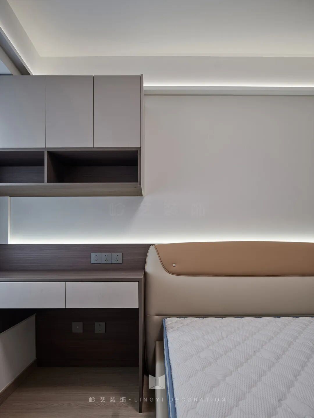 儿童房除了和其他卧室相似的设计外,还额外增加了吊柜。吊柜可以用来存放孩子的过季衣物、大型玩具等不常用的物品,进一步提升了收纳能力,满足了儿童房物品存放的需求。而且吊柜的位置较高,不会影响孩子在房间内的活动空间,保障了孩子的安全。