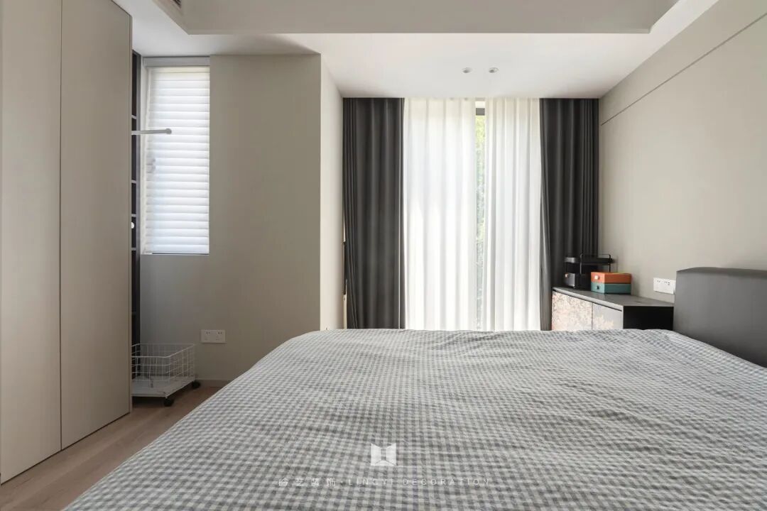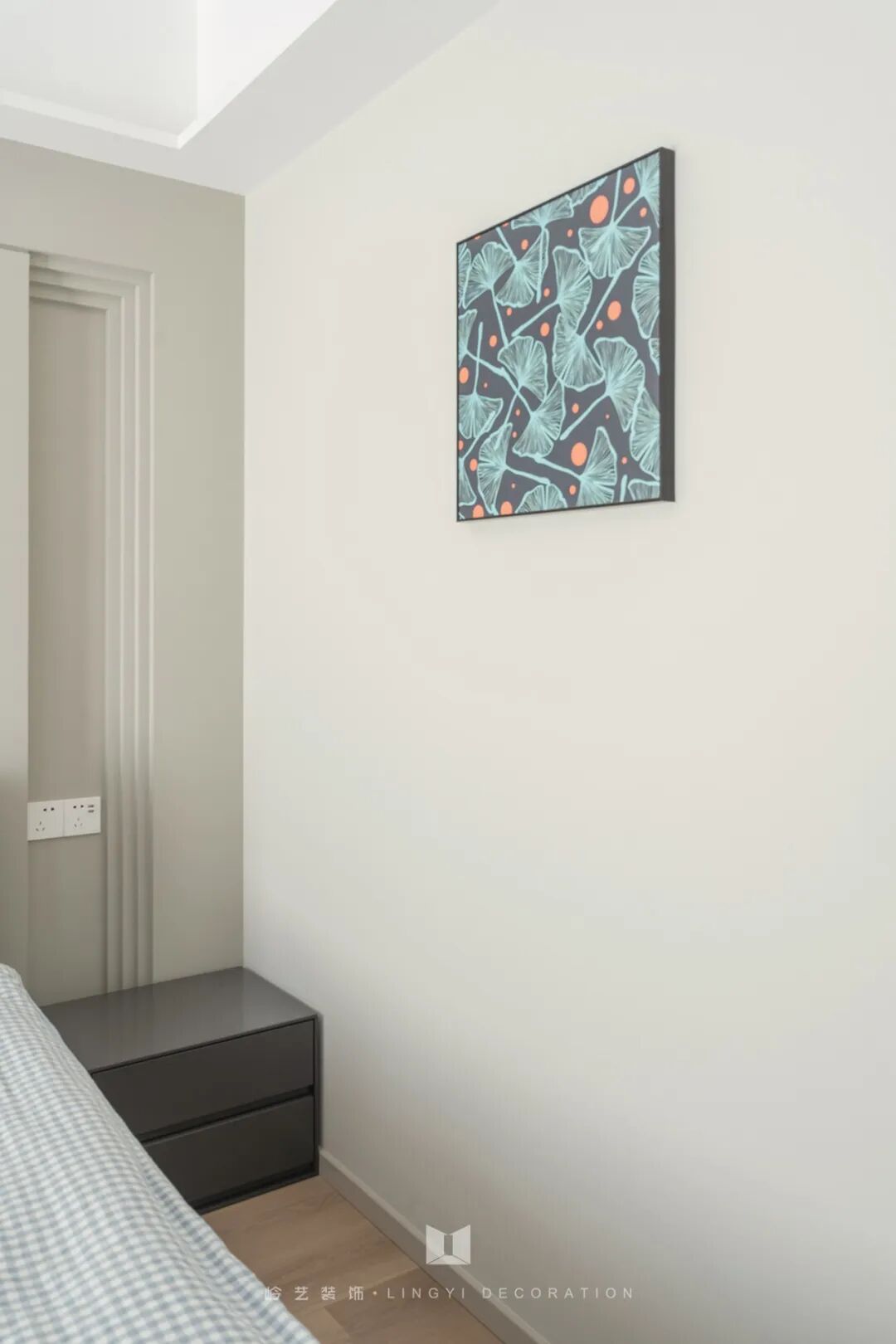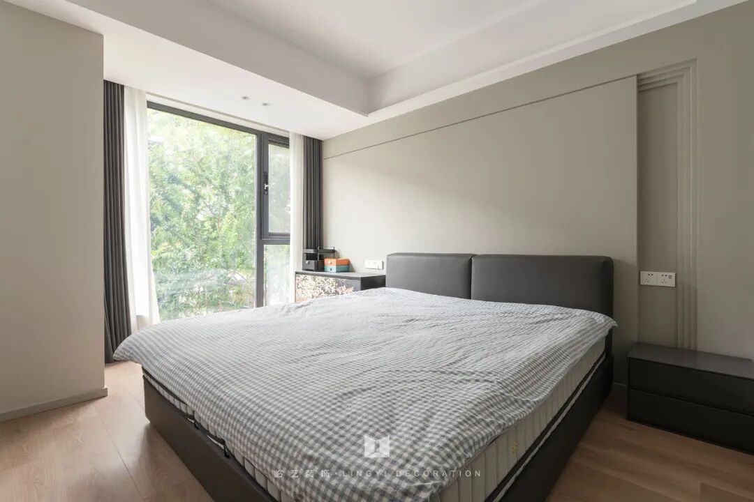 床头背景的设计堪称一绝,设计师巧妙地利用了原始墙面的凹槽,打造出一组独特的斯卡帕造型。斯卡帕风格强调材料和细节的表达,这种造型通过精致的线条和独特的拼接方式,为墙面增添了一份艺术气息和立体感。