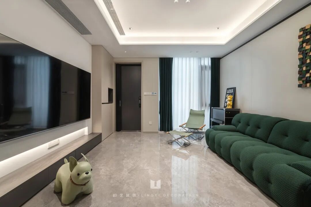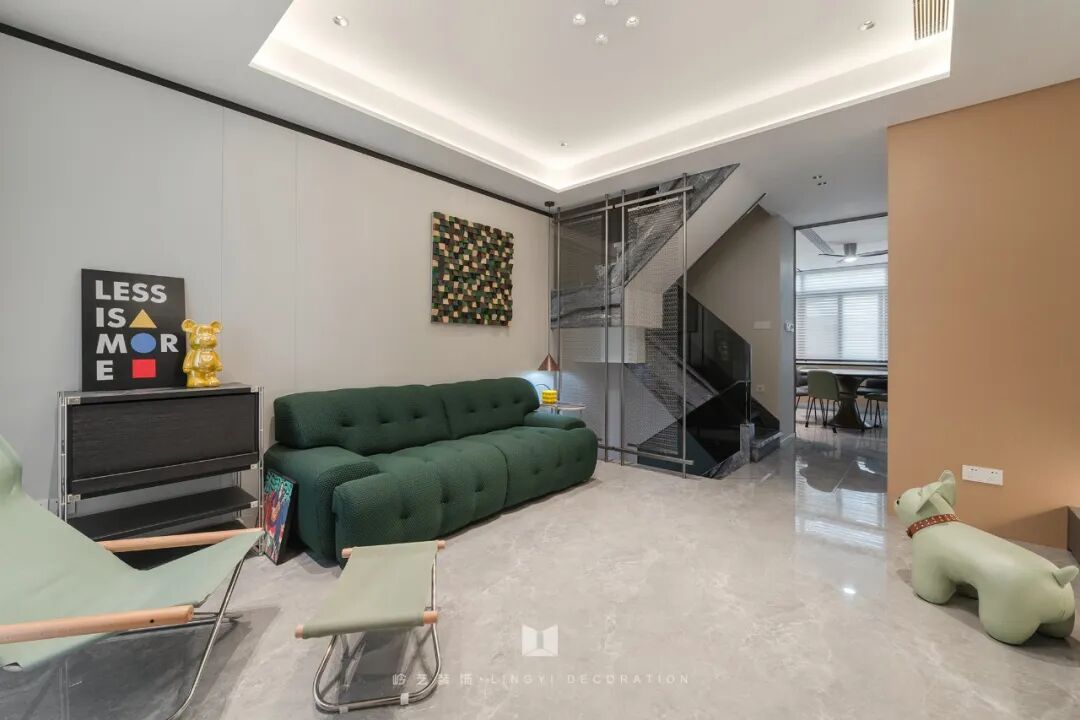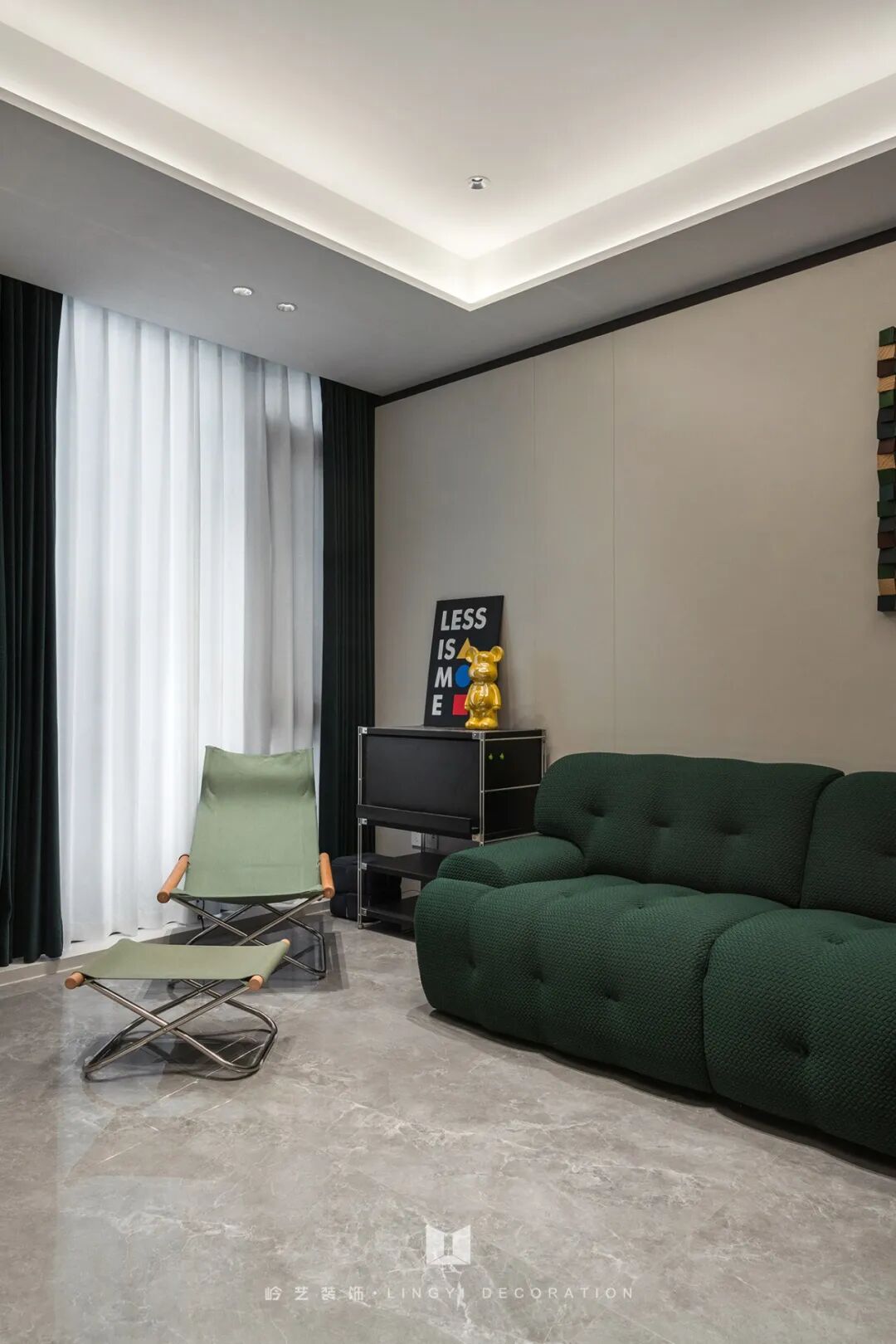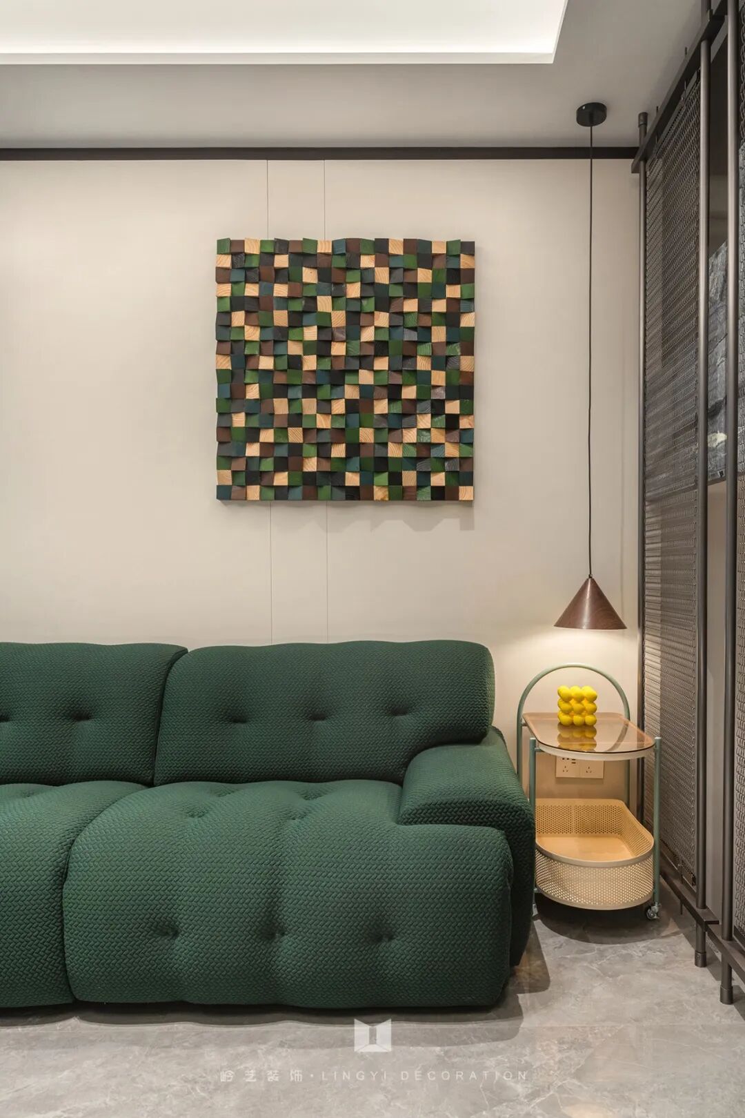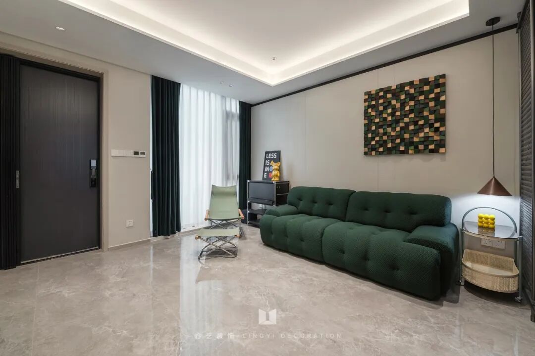墨绿色沙发、挂画、边柜和躺椅的搭配,营造出了居住的松弛氛围,每一处细节都透露着随性与自在,完美契合年轻人追求的生活态度,符合他们的审美。