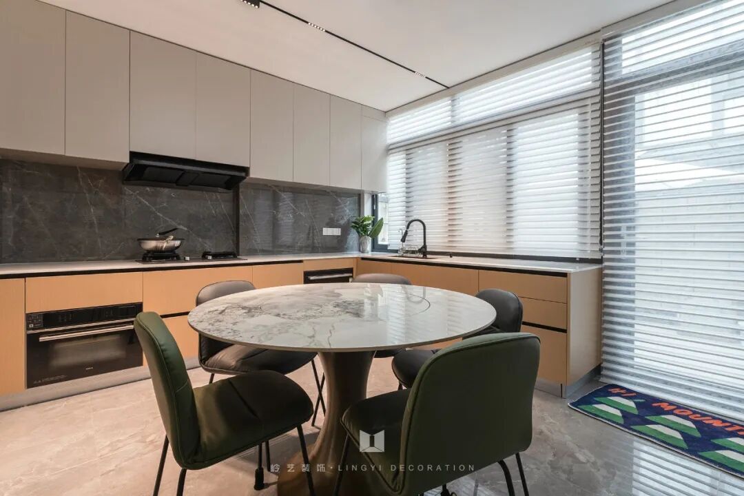 在这套别墅的设计中,餐厨区域的规划是一大亮点。业主原本的厨房和餐厅面积都不算宽敞,如果按照传统布局,不仅空间显得局促,操作起来也多有不便。