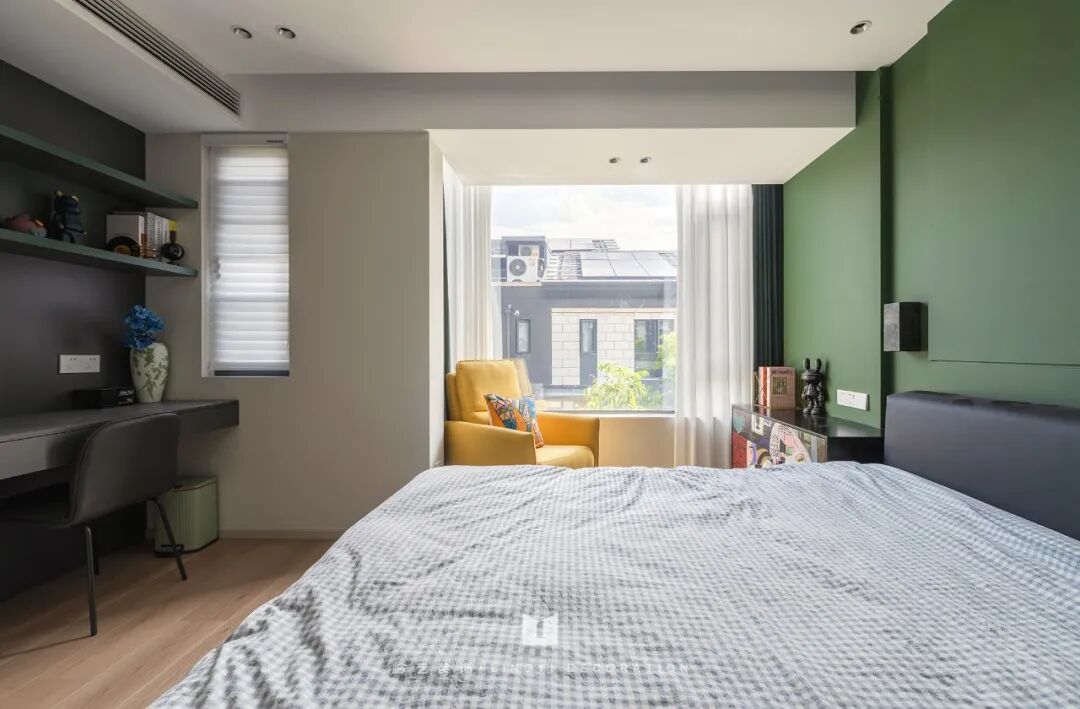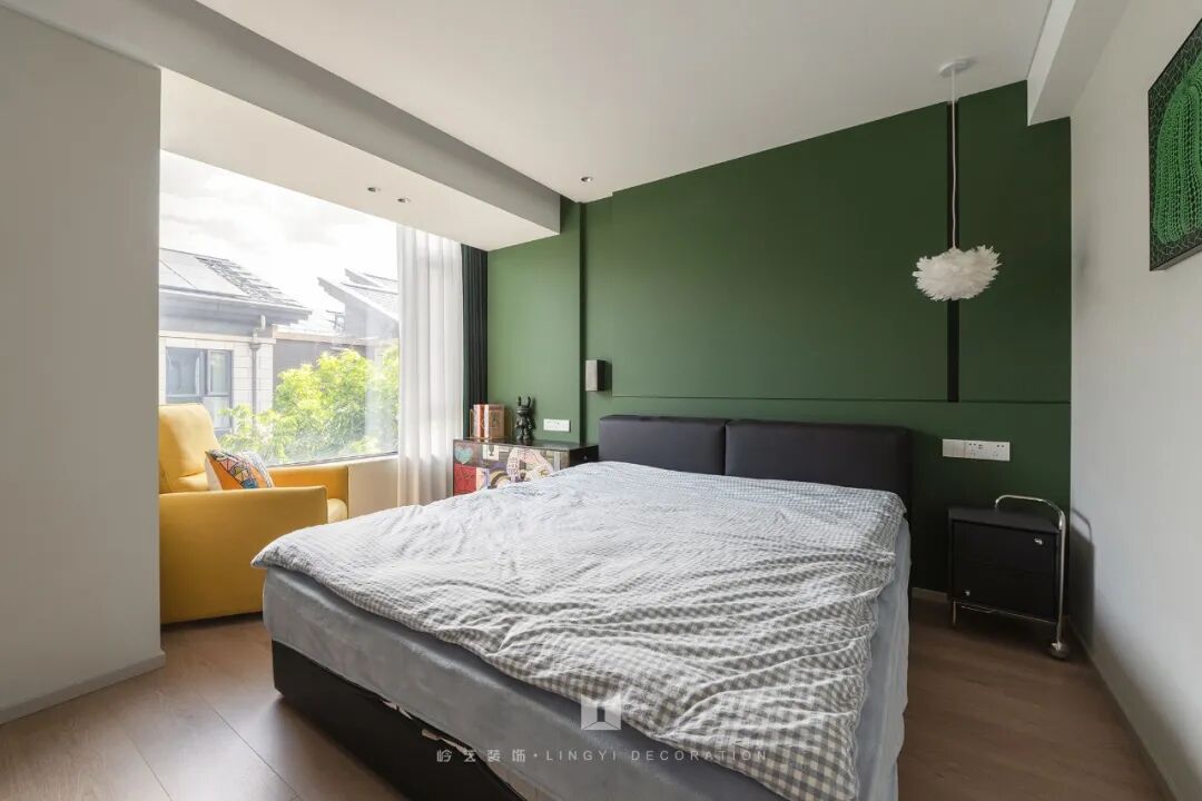 二层的另一间卧室作为客房,同样在设计上别具匠心。整个房间满墙涂刷着墨绿色的乳胶漆,这种墨绿色与客厅沙发的颜色相呼应,但又有着不同的韵味。