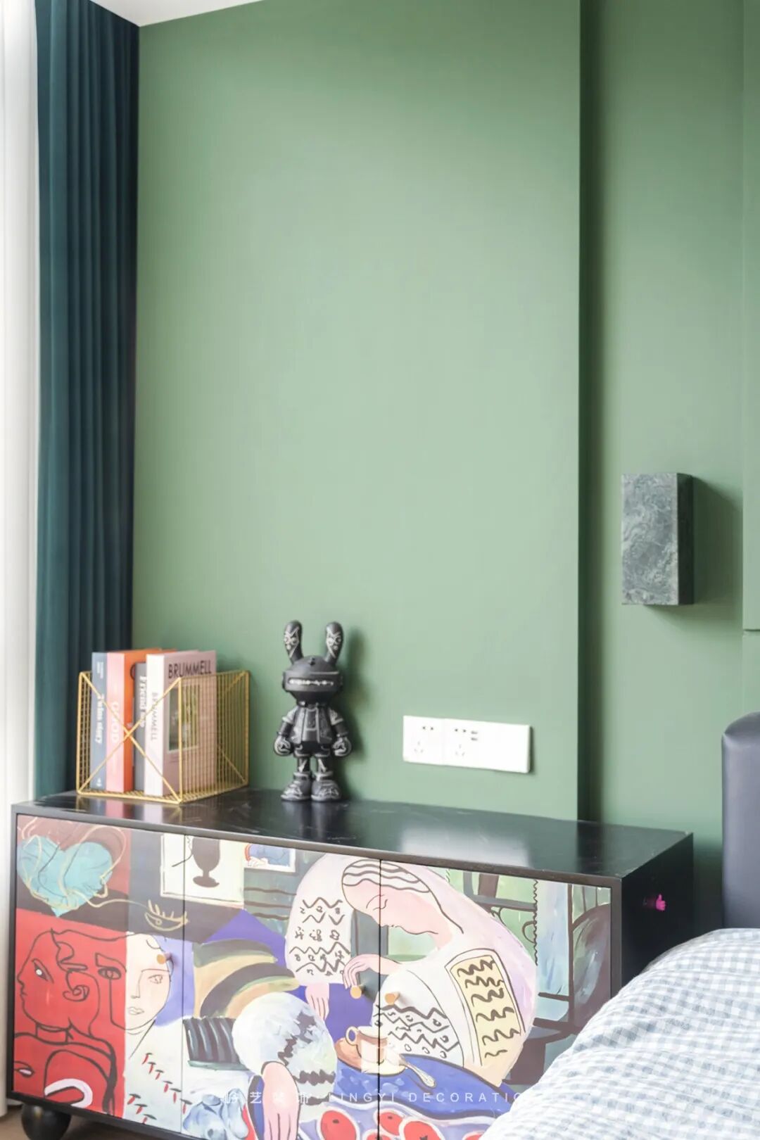 在墨绿色床头背景的衬托下,潮玩和装饰画的搭配更是将个性发挥到了极致。各种造型独特的潮玩摆放在床头两侧的置物架上,让人仿佛置身于一个艺术收藏家的私人收藏室。