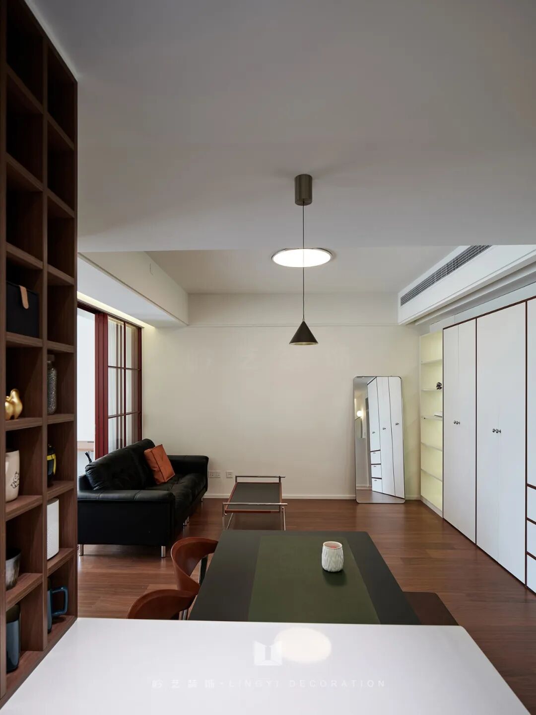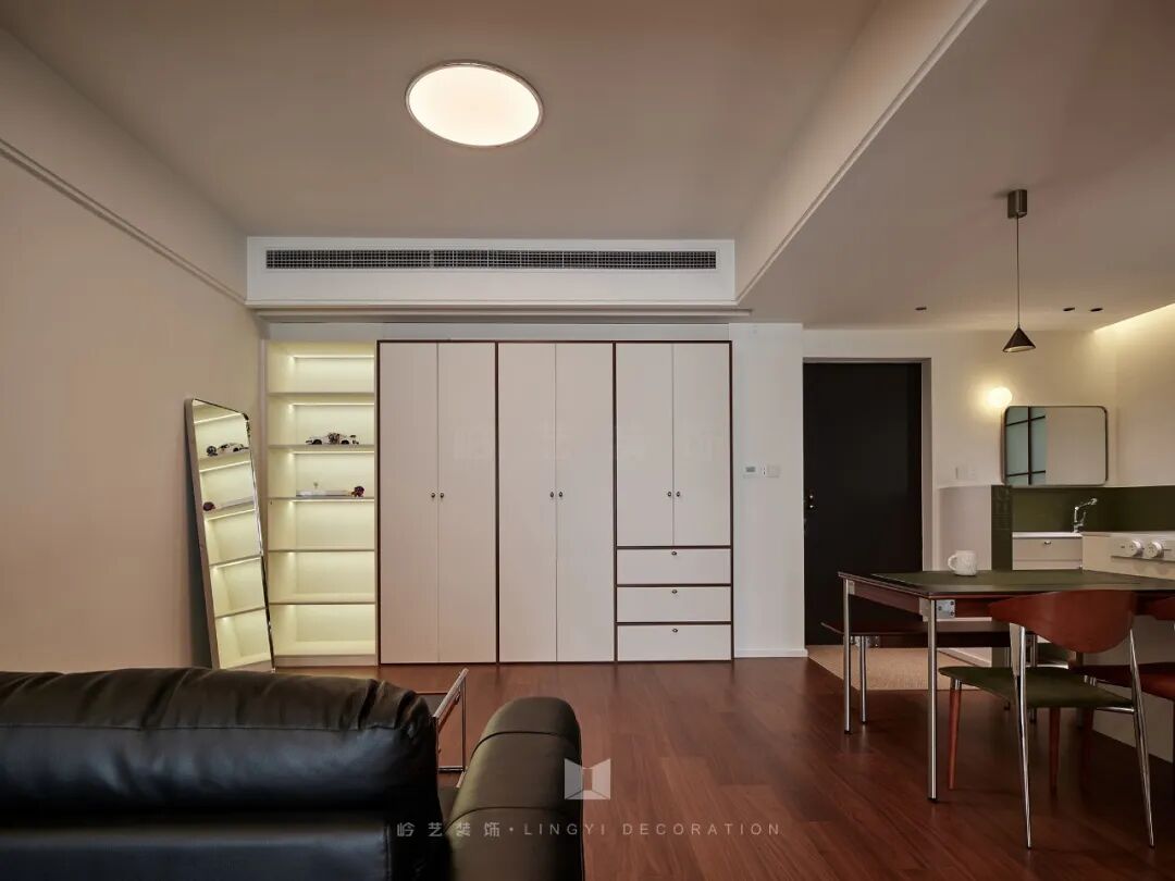 客厅里没有传统的电视,取而代之的是投影仪 + 储物组合,不仅释放了空间,还为业主打造了一个专属的私人影院,满足了现代人对娱乐和收纳的双重需求。