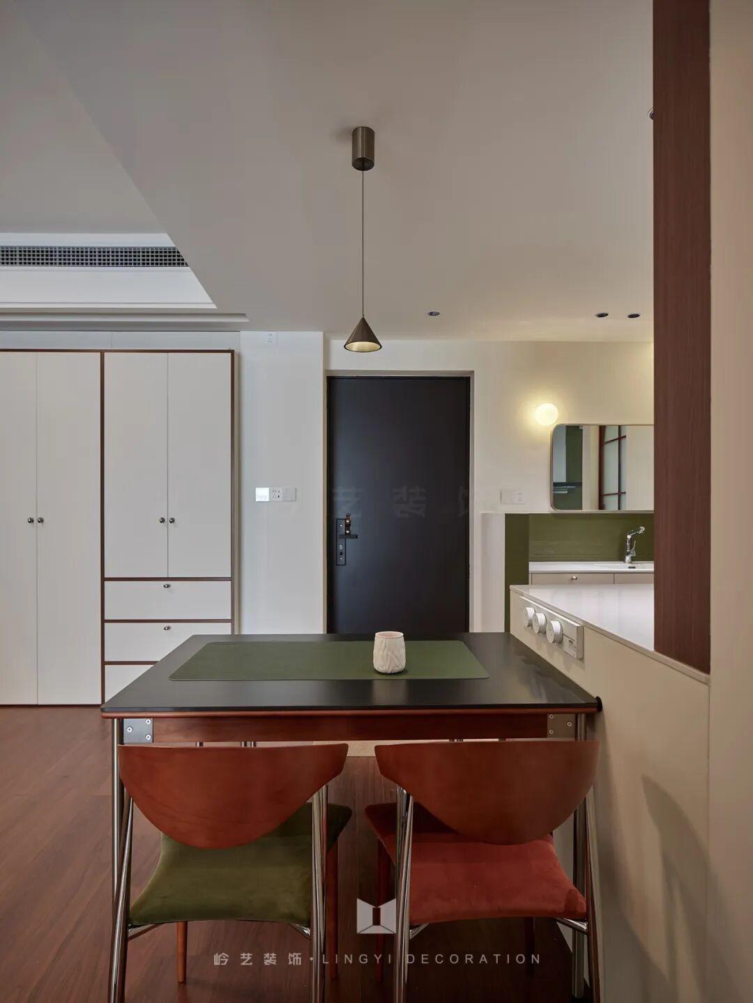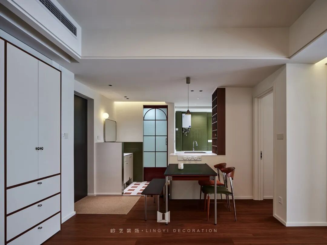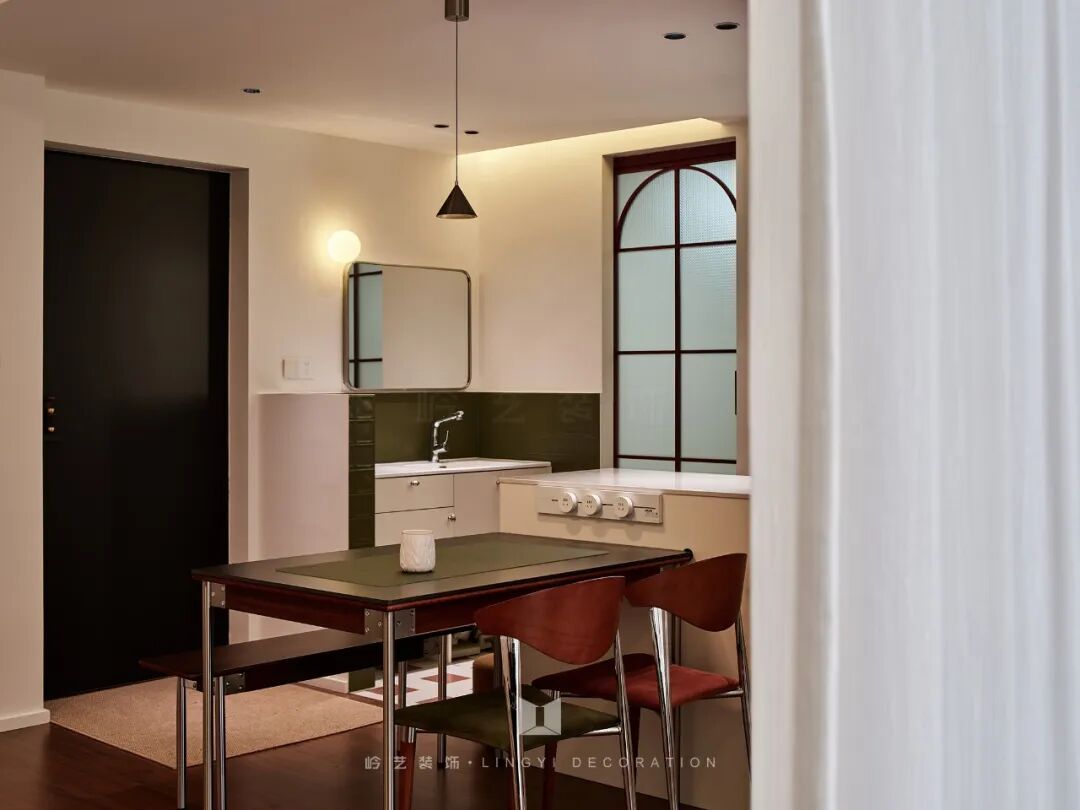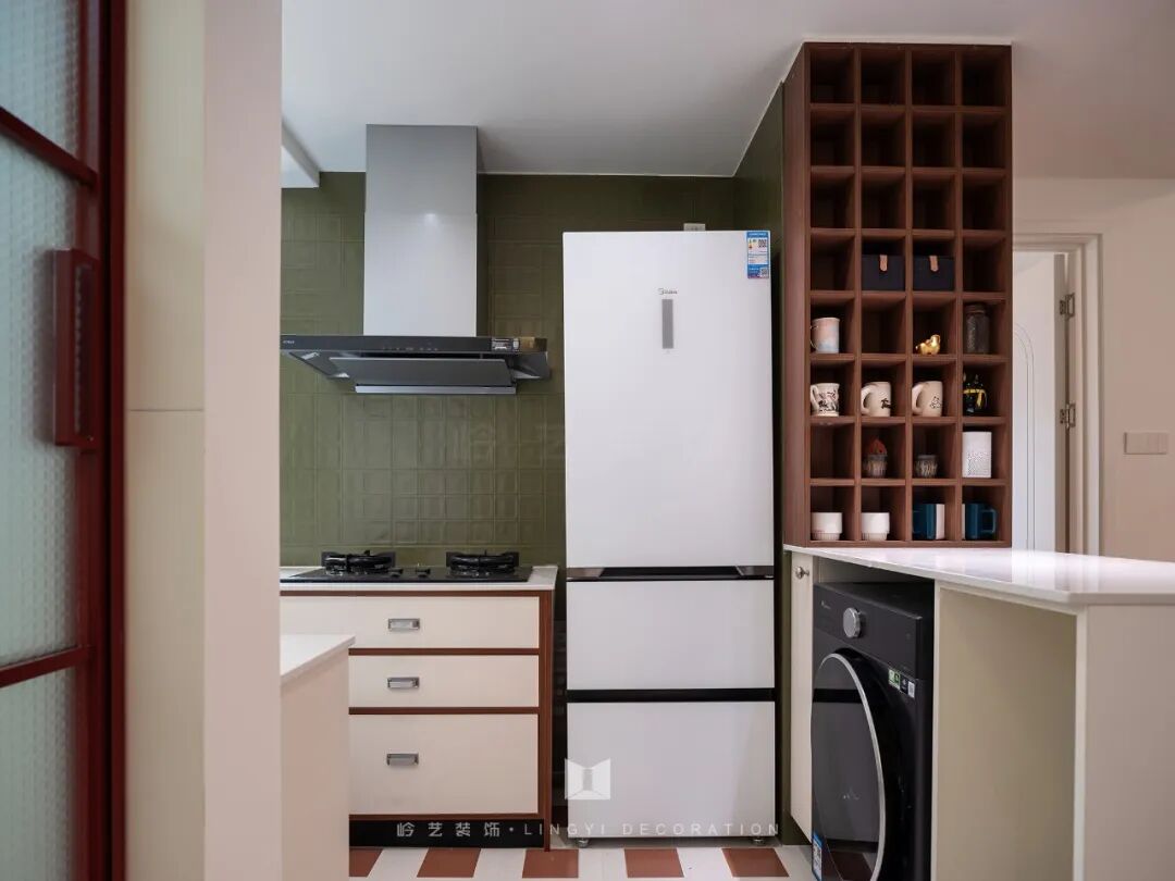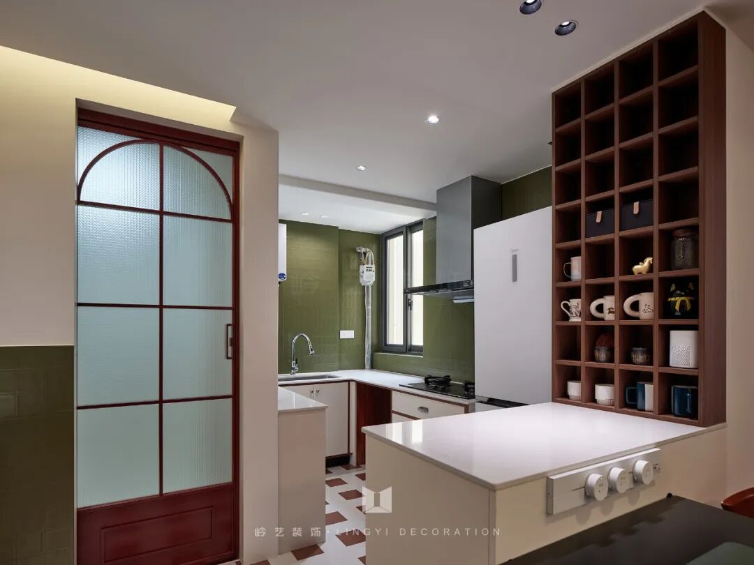 厨房绿色的墙面,更是整个空间的点睛之笔,它不仅契合了女主人对中古风格及色彩感的偏好,还打破了传统厨房的单调,为烹饪时光增添了一抹别样的色彩。