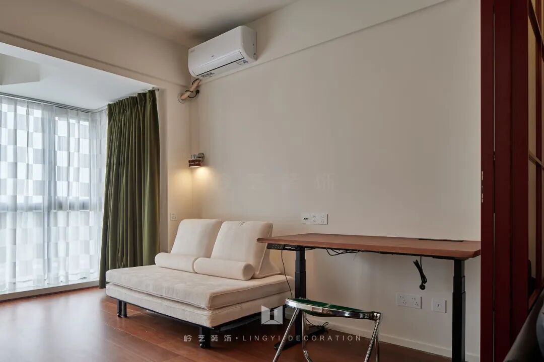 次卧不仅是休息的地方,更是一个多功能房。内置的可升降书桌,搭配折叠沙发床,让这个空间可以根据业主的需求随时切换功能。白天,它是一个安静的书房,业主可以在这里专心工作、学习;晚上,它又能变成舒适的客房,为留宿的客人提供温暖的床铺。