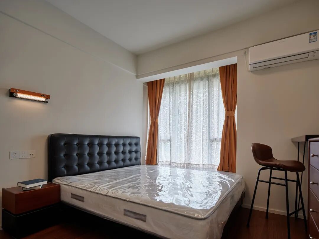 主卧没有采用传统的衣柜,而是以“钢架 + 木饰面” 打造储物空间,不仅储物量更大,还展现出一种简约时尚的风格。
