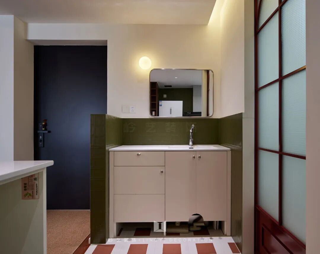 卫生间虽小,却处处彰显着设计师的用心。红色的移门——这抹红色,与地面的花砖同属一个色系,相互呼应,仿佛是一场色彩的对话。移门上的半圆元素,更是巧妙地契合了中古风格的特点,为卫生间增添了一份优雅与浪漫。