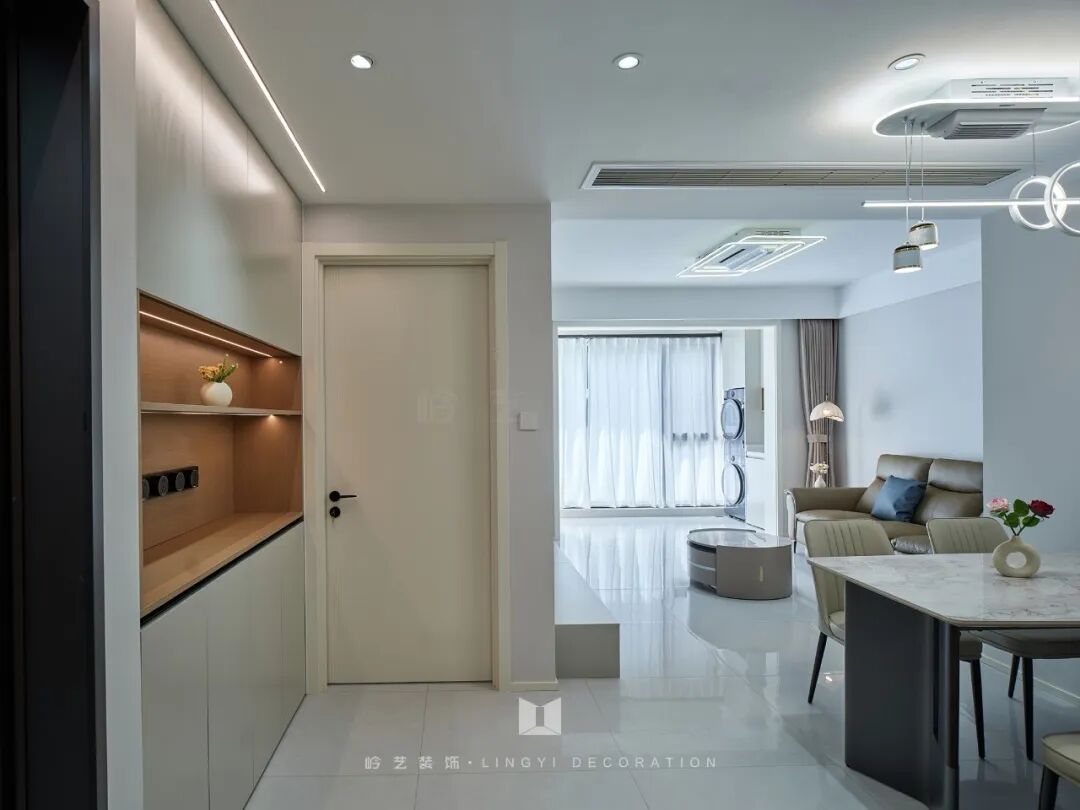 在这次装修改造中,设计师在入门处增设了带端景和抽屉的玄关柜。这个设计主要是为了解决原户型入口正对卫生间门的尴尬问题。