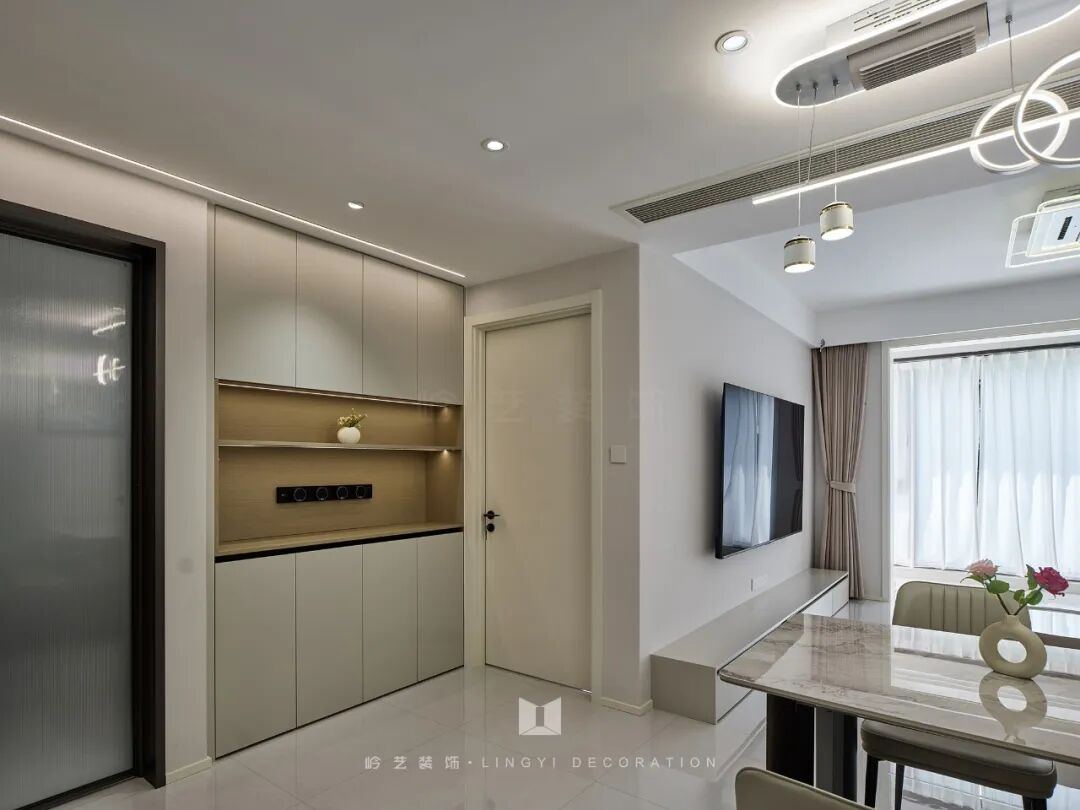 同时设计师也借助这个空间打造了餐边柜。餐边柜的加入,大大增加了餐厅的收纳功能,可以存放餐具、酒水、零食等各种物品。