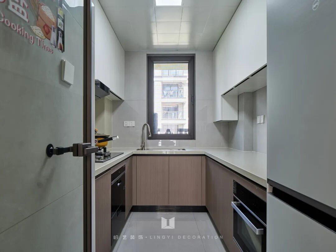 厨房的改造重点在于墙体布局的调整。为了解决冰箱的放置问题,借用了北卧的部分空间。具体操作是将厨房与北卧相邻的墙体进行了重新规划,合理地开辟出一块空间用来放置冰箱。