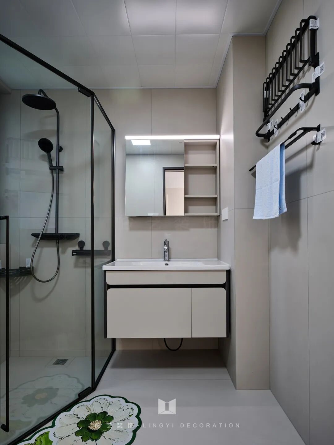 卫生间设下沉式淋浴房,下沉式淋浴房通过将淋浴区域地面整体向下挖 1.5 - 2.5cm,形成低于干区的凹槽式区域。由于没有了传统挡水条的阻挡,干区地砖始终能保持干爽,有效防止了积水外溢到干区,避免了因地面湿滑而导致的摔倒风险,老人和小孩使用起来也更加安全。