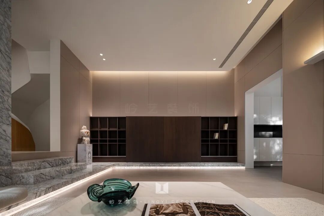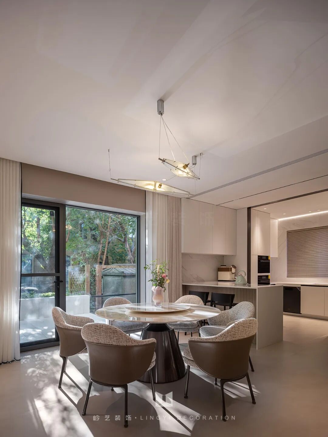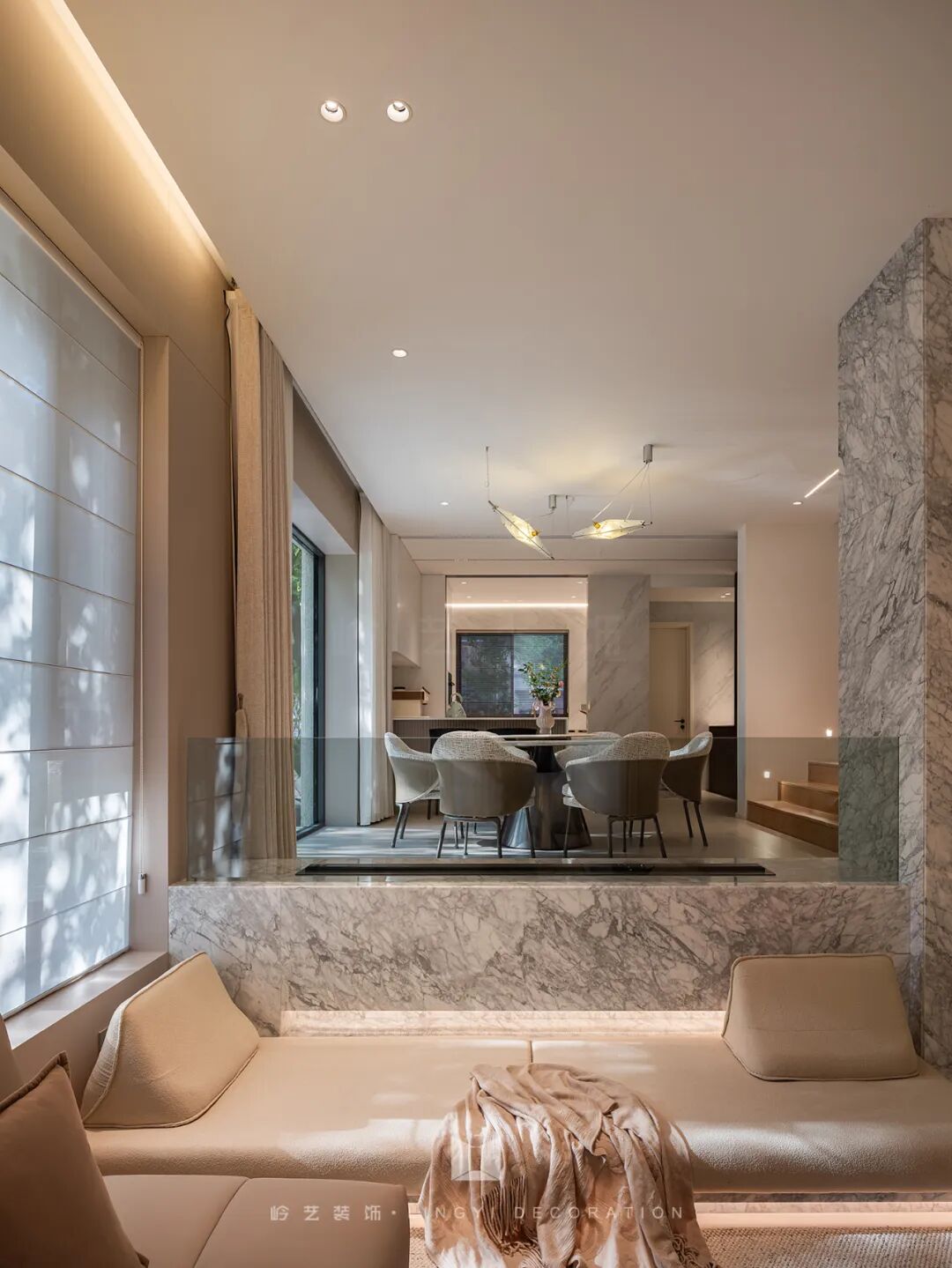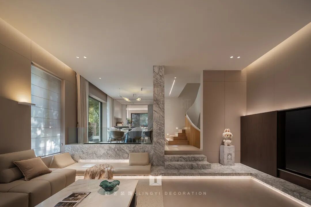 客厅里,每一处设计都藏着对生活的关照。地台与踏步顺着空间脉络连贯延伸,流畅的线条悄悄拉宽视觉,台下嵌入式灯带在夜色中亮起,暖光漫溢间,地台仿佛悬浮在空中,添了几分梦幻灵动。 朝南面的半落地窗户,以及朝西面的两扇窗户,为客厅引入了充足的自然光线。阳光透过窗户洒在地面上,随着时间的推移,光影不断变幻,为空间增添了一份生机与活力。 顶面刻意减少顶灯数量,让光线从混油材质的墙板、温润的地面反射开来,裹着面包豆腐块沙发的柔软坐感,无论是家人围坐聊天,还是友人闲叙家常,都满是松弛氛围。 转身步入餐厅,1.5 米的餐桌搭配上一旁的吧台,构成了一个既实用又充满生活气息的空间。当美味的菜肴从厨房端出,可以先放置在吧台上稍作停留,再有条不紊地传递到餐桌上。 这一小小的过渡,不仅缩短了上菜的行程,更让用餐的过程变得更加从容。如果有客人来访,还可以在吧台上先小酌一杯,等待餐食准备就绪,为用餐增添了一份别样的乐趣。 原本孤立的柱子,被设计师用与地台一致的材质包裹,瞬间成了连接客厅与餐厅的自然纽带;柱子与客厅间的玻璃隔断,既悄悄划分了空间,又不遮挡光线,两个区域的场景相互渗透,视觉上始终开阔通透。 从一楼拾级而上,楼梯成了空间转换的浪漫媒介。摒弃了原本不便的欧式喇叭口设计,新楼梯以盘旋的姿态向上延伸—— 外侧的钢板泛着现代极简,内侧的木饰面却透着温润的居家感。 二楼的起居室,是隔绝喧嚣的缓冲带。这里没有一楼的热闹,却有着恰到好处的宁静,午后坐在沙发上读一本好书,傍晚陪孩子搭一会儿积木,时光都慢了下来。 穿过起居室便是二楼主卧,推开门的瞬间,柔和的色调瞬间抚平心绪。房间里没有刺眼的主灯,顶面的慢反射灯槽在夜色中漫出柔光,均匀洒在床品、地毯上,连影子都变得温柔,躺下时,仿佛被柔软的云朵包裹,疲惫渐渐消散。