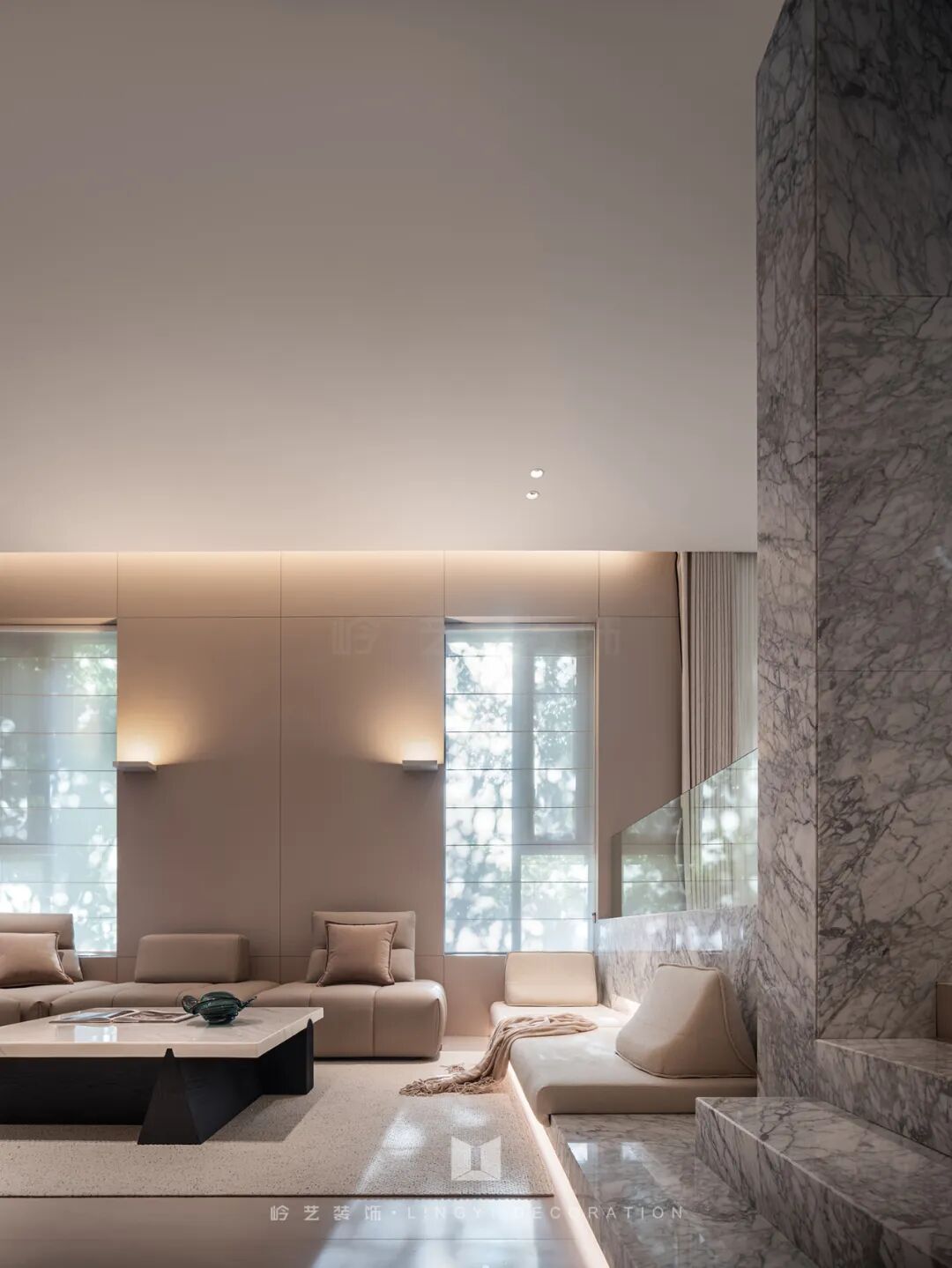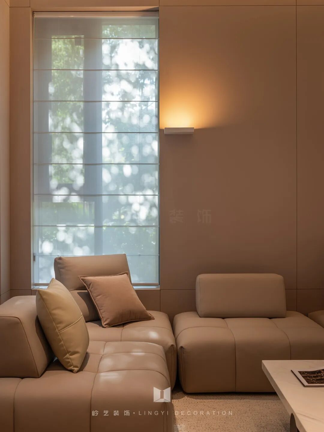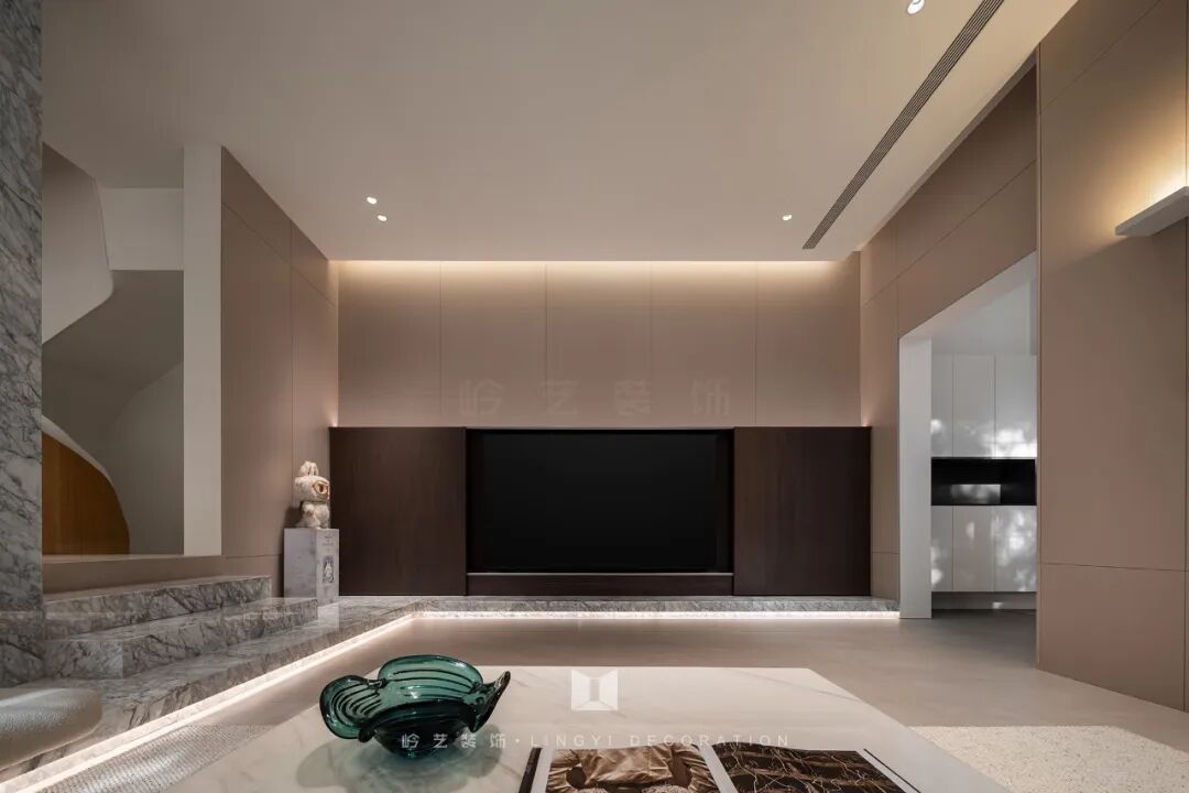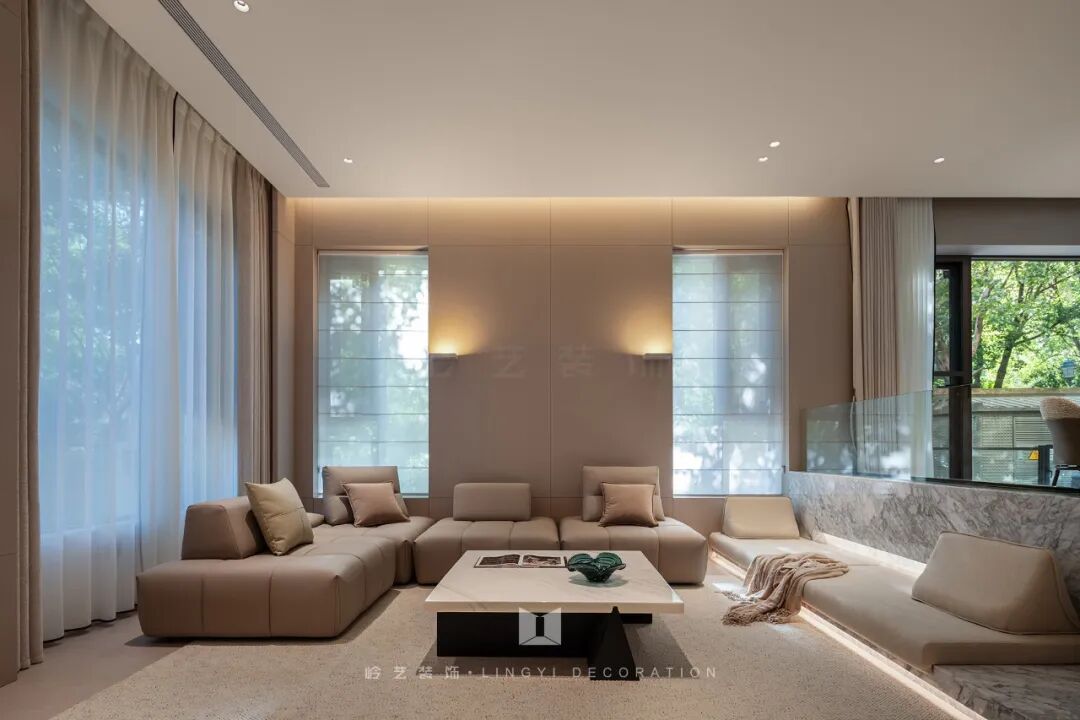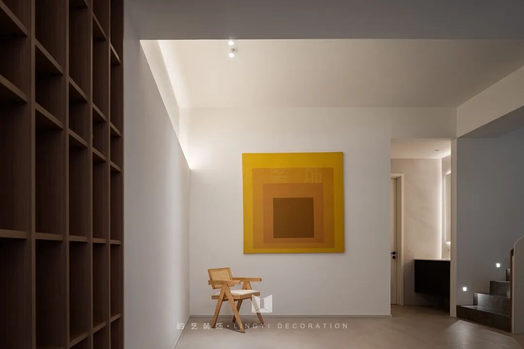 客厅里,每一处设计都藏着对生活的关照。地台与踏步顺着空间脉络连贯延伸,流畅的线条悄悄拉宽视觉,台下嵌入式灯带在夜色中亮起,暖光漫溢间,地台仿佛悬浮在空中,添了几分梦幻灵动。 朝南面的半落地窗户,以及朝西面的两扇窗户,为客厅引入了充足的自然光线。阳光透过窗户洒在地面上,随着时间的推移,光影不断变幻,为空间增添了一份生机与活力。 顶面刻意减少顶灯数量,让光线从混油材质的墙板、温润的地面反射开来,裹着面包豆腐块沙发的柔软坐感,无论是家人围坐聊天,还是友人闲叙家常,都满是松弛氛围。 转身步入餐厅,1.5 米的餐桌搭配上一旁的吧台,构成了一个既实用又充满生活气息的空间。当美味的菜肴从厨房端出,可以先放置在吧台上稍作停留,再有条不紊地传递到餐桌上。 这一小小的过渡,不仅缩短了上菜的行程,更让用餐的过程变得更加从容。如果有客人来访,还可以在吧台上先小酌一杯,等待餐食准备就绪,为用餐增添了一份别样的乐趣。 原本孤立的柱子,被设计师用与地台一致的材质包裹,瞬间成了连接客厅与餐厅的自然纽带;柱子与客厅间的玻璃隔断,既悄悄划分了空间,又不遮挡光线,两个区域的场景相互渗透,视觉上始终开阔通透。 从一楼拾级而上,楼梯成了空间转换的浪漫媒介。摒弃了原本不便的欧式喇叭口设计,新楼梯以盘旋的姿态向上延伸—— 外侧的钢板泛着现代极简,内侧的木饰面却透着温润的居家感。 二楼的起居室,是隔绝喧嚣的缓冲带。这里没有一楼的热闹,却有着恰到好处的宁静,午后坐在沙发上读一本好书,傍晚陪孩子搭一会儿积木,时光都慢了下来。 穿过起居室便是二楼主卧,推开门的瞬间,柔和的色调瞬间抚平心绪。房间里没有刺眼的主灯,顶面的慢反射灯槽在夜色中漫出柔光,均匀洒在床品、地毯上,连影子都变得温柔,躺下时,仿佛被柔软的云朵包裹,疲惫渐渐消散。