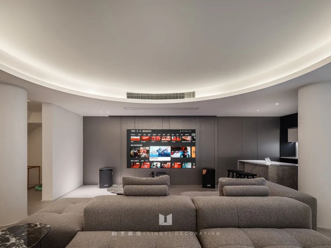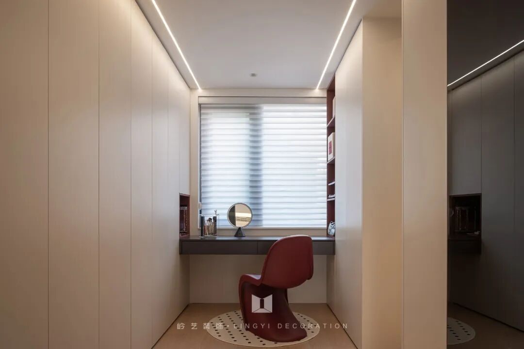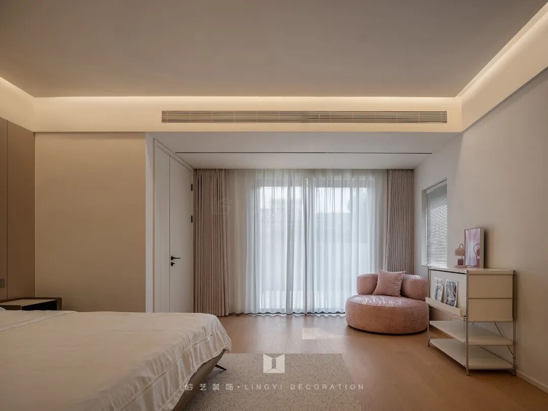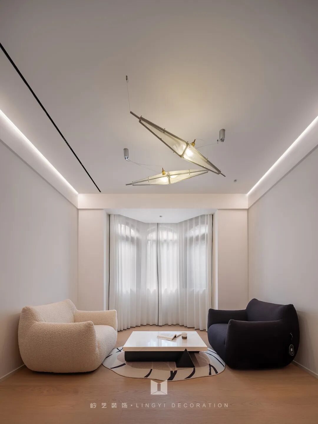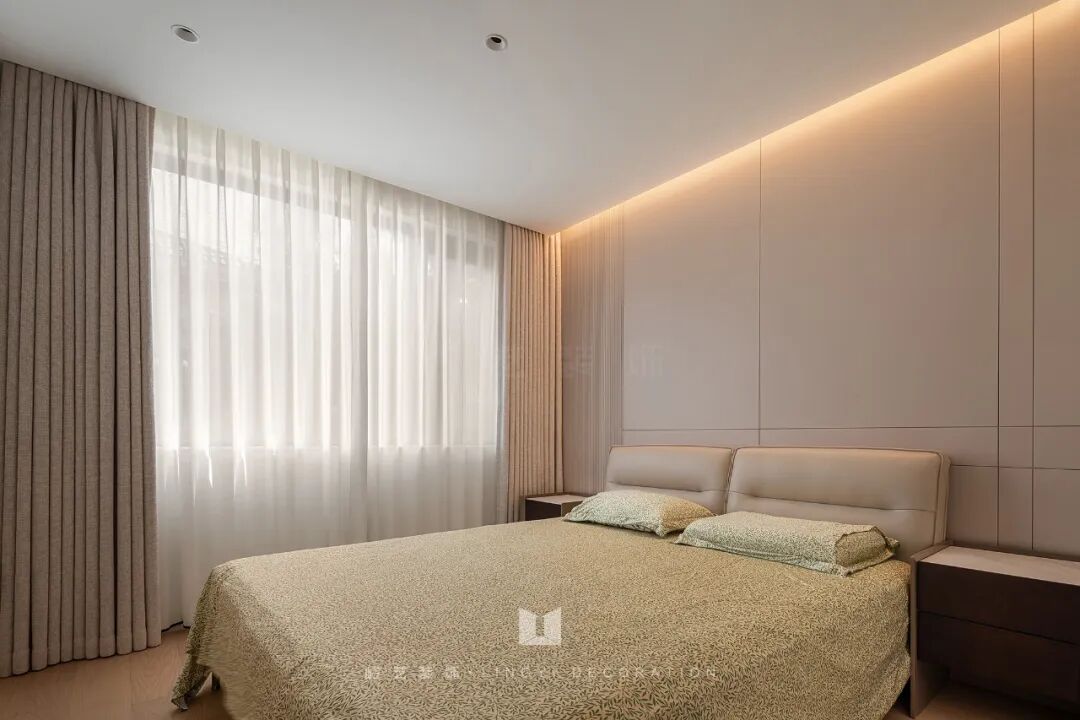 卧室的吊顶是悬浮式设计,没有繁复的装饰,却让空间显得轻盈又开阔,反光灯槽的暖光漫在墙面,夜晚躺在床上,连呼吸都变得舒缓。