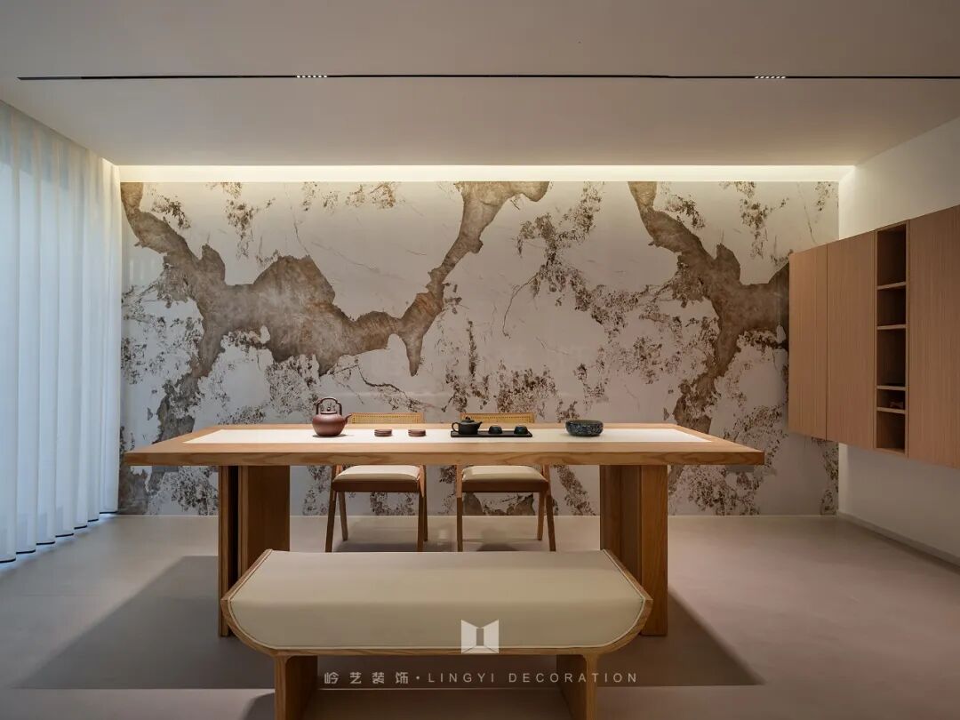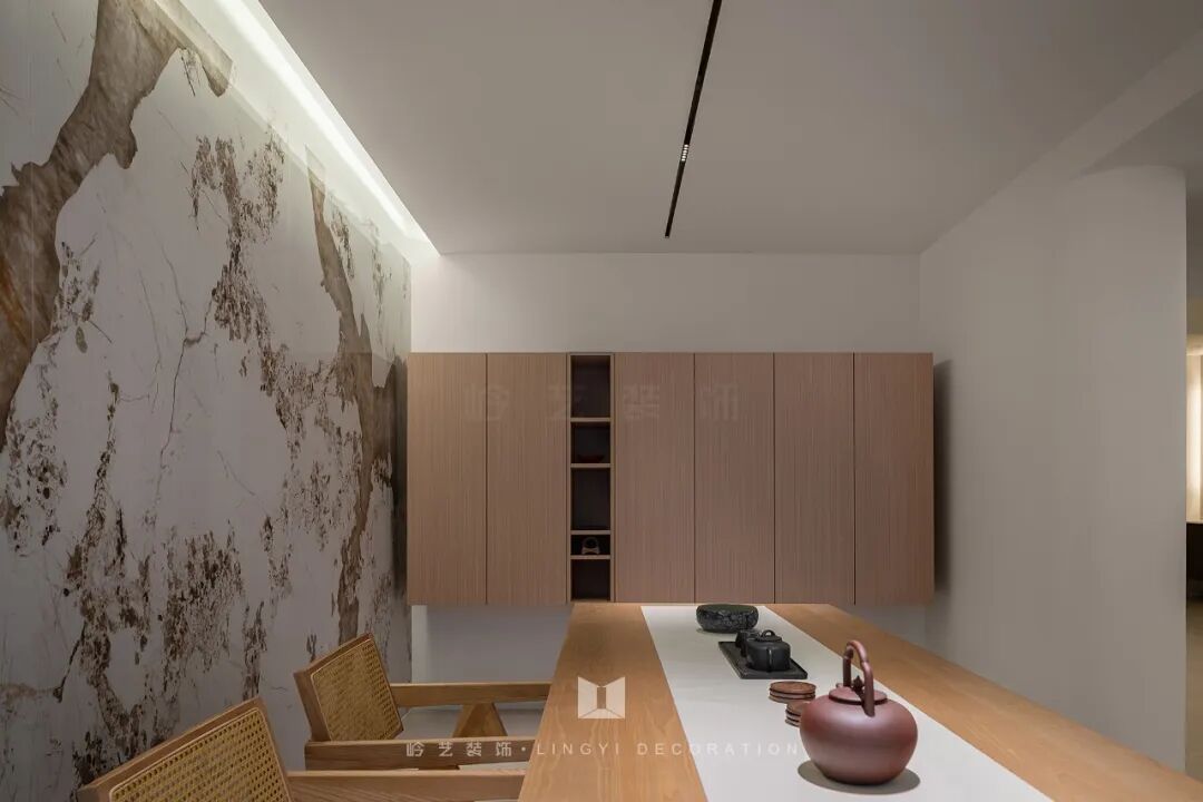 而茶室,则是地下室里的宁静一隅。它由原本的天井加建而成,封上天井时,特意保留了充足的采光,阳光透过窗户洒进来,在木质地板上投下斑驳的光影,像一幅流动的画。