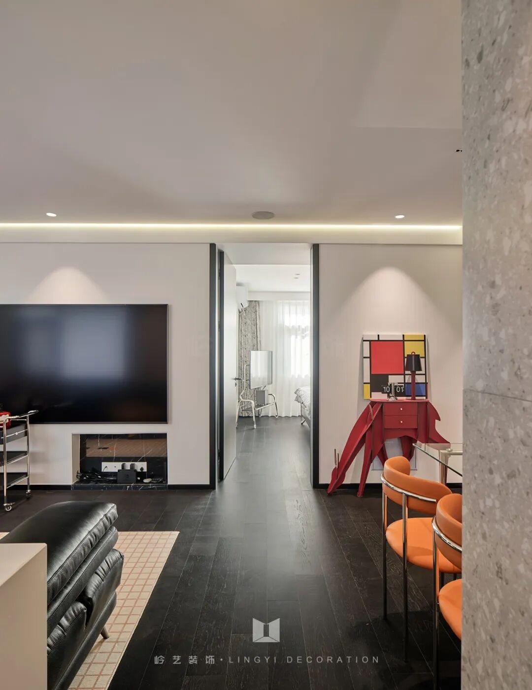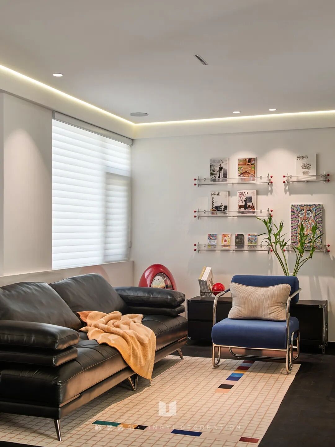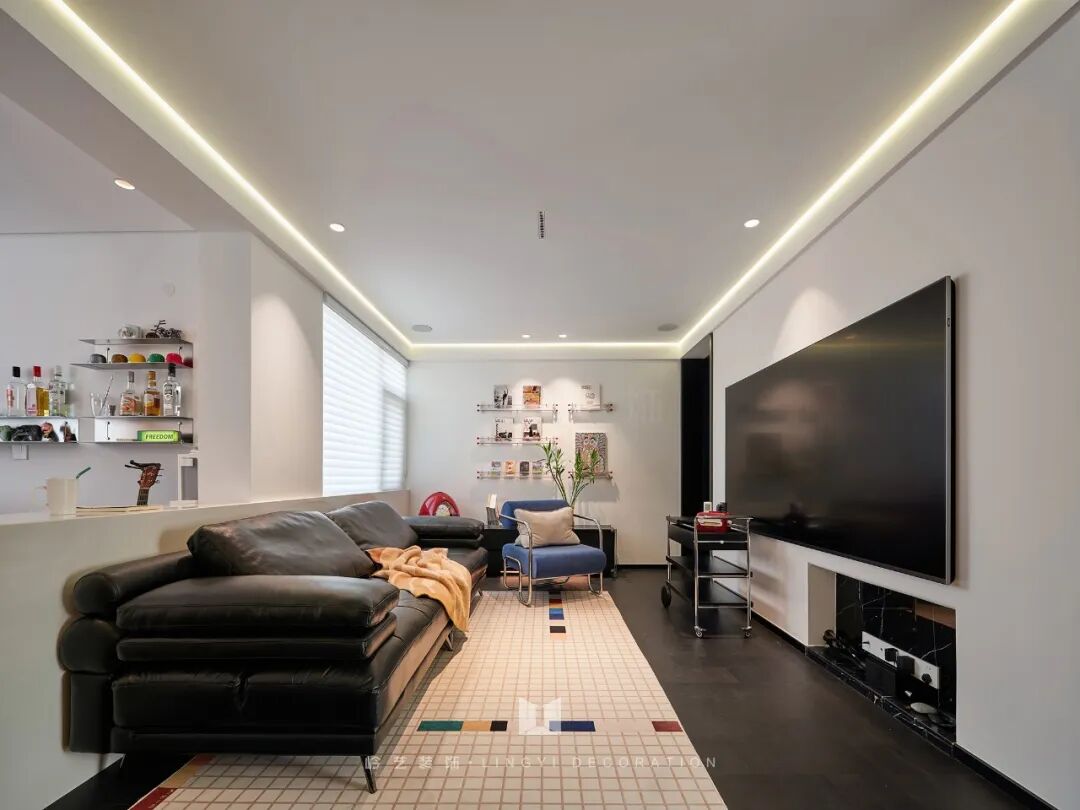 门洞的改造巧思:原始门洞位置打乱了客厅轴线的完整性,设计师将其移至东侧,原门洞并未完全封死,而是预留出壁龛空间,既可收纳机顶盒、游戏机等设备,既化解了空间先天缺陷,又让闲置角落蜕变为承载生活态度的展示区,每一处改造都精准服务于空间美学与实用需求。