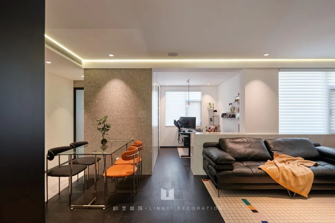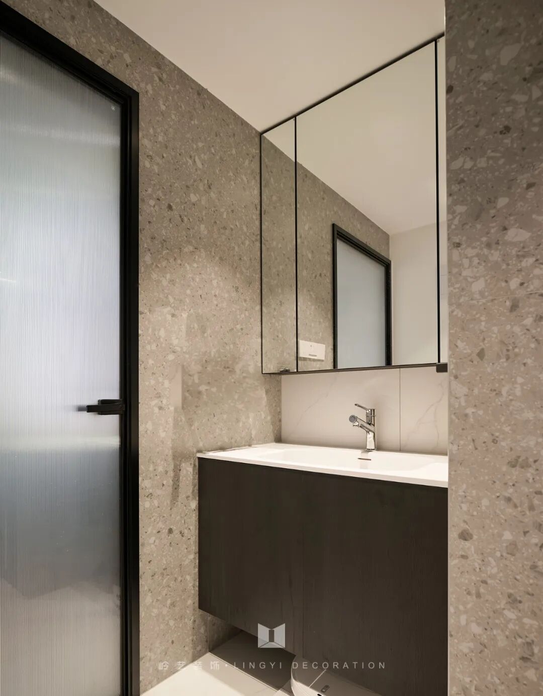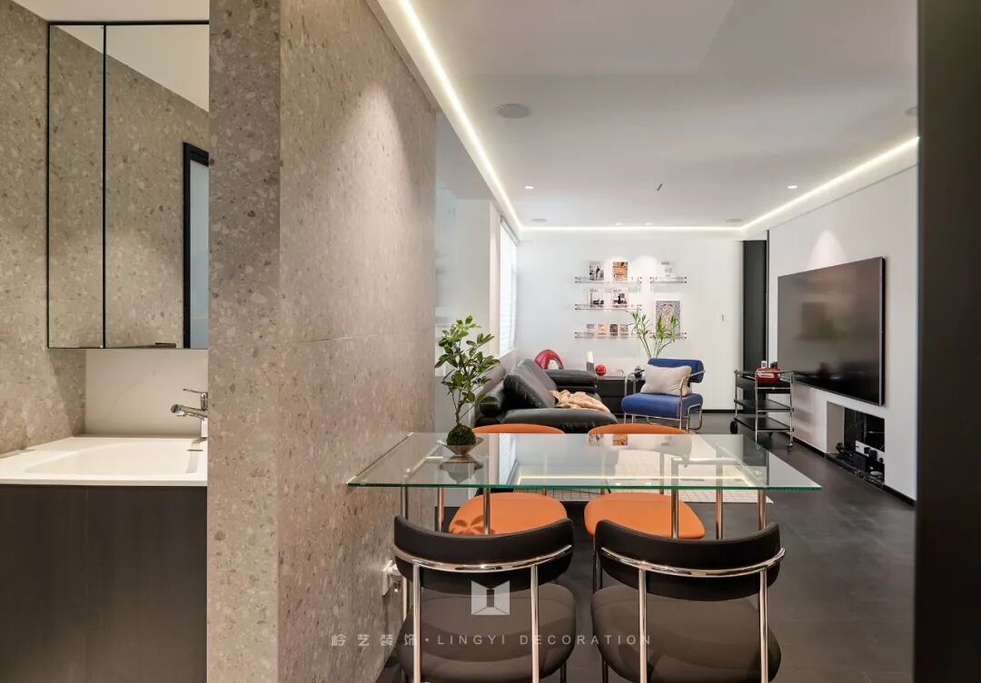 餐厅恰好处于两条过道之间,设计师顺势将卫生间干区的仿水磨石墙砖整体延伸至餐厅墙面,无需额外打造背景墙,便以自然材质界定出餐厅区域。水磨石纹理自带复古质感,与地面地砖形成巧妙拼色,既与全屋简约格调契合,又因材质耐脏易清洁的特性,完美适配餐厨空间的使用需求。