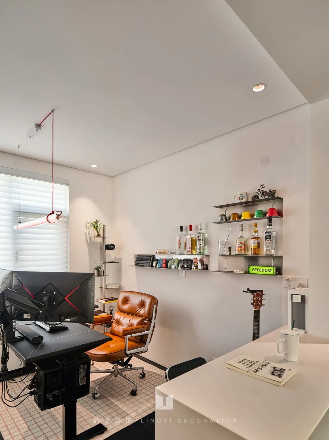开放式书房中,一个吧台靠墙而立,下方摆放着各种小零食和小饮料,瞬间成为家中的休闲中心。