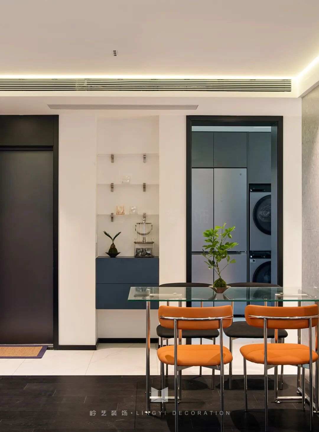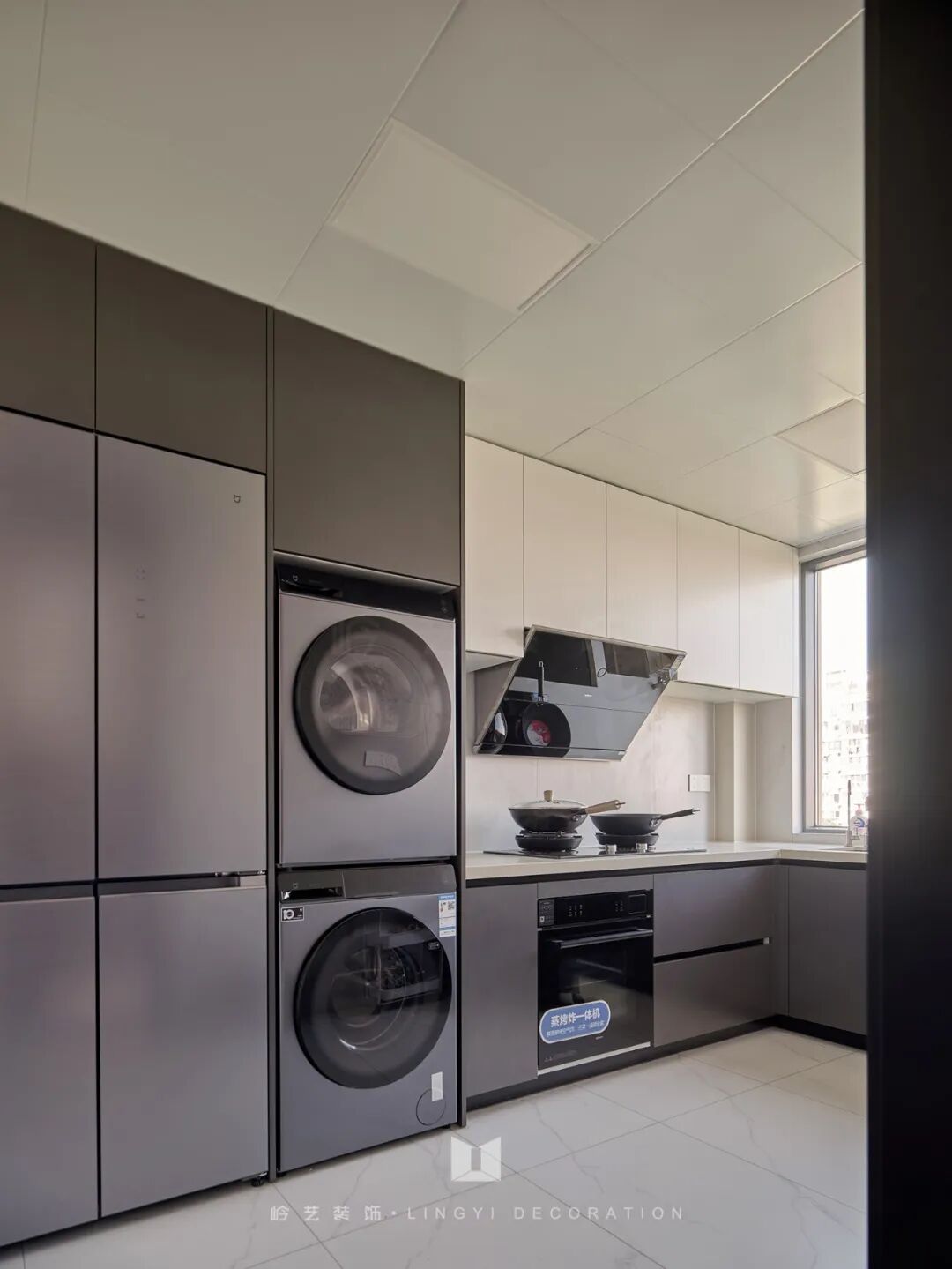 走进厨房,你会发现这里的设计同样充满巧思。设计师打破传统,将洗衣机和烘干机放置在厨房,充分利用了厨房宽敞的空间。4 米长的台面搭配双开门零嵌冰箱,满足日常烹饪和储存需求,而洗衣机和烘干机的加入,让整个水路集中在这一块,热水供应更快,同时也解放了阳台。