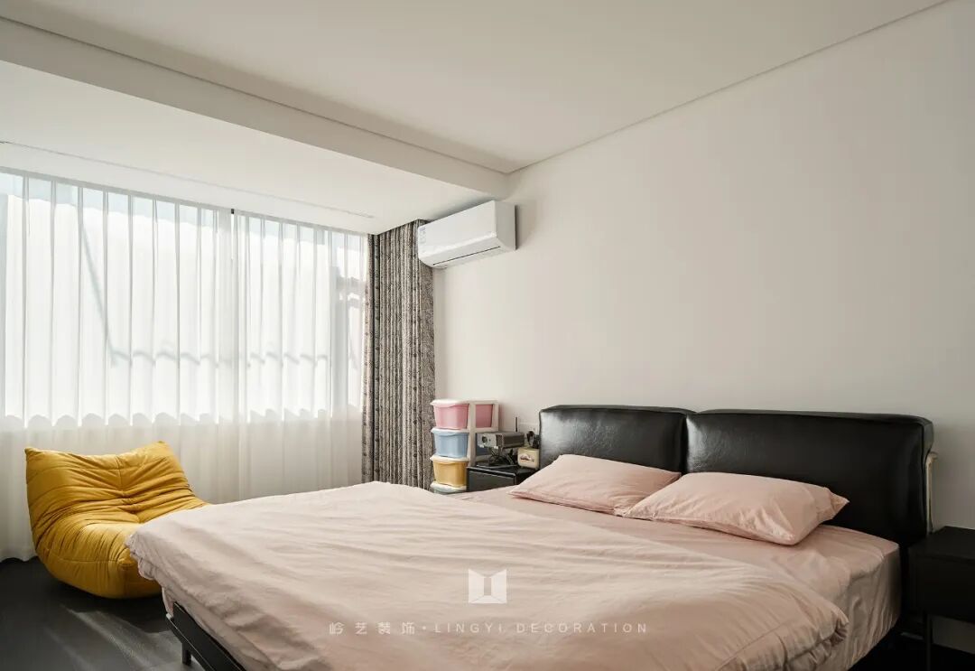 移至东侧后的卧室门洞则设计成无顶框门,打破传统门体的束缚,让吊顶与室内线条自然衔接,形成整体化的面线关系,让空间更显简洁开阔,视觉上更具延伸感。