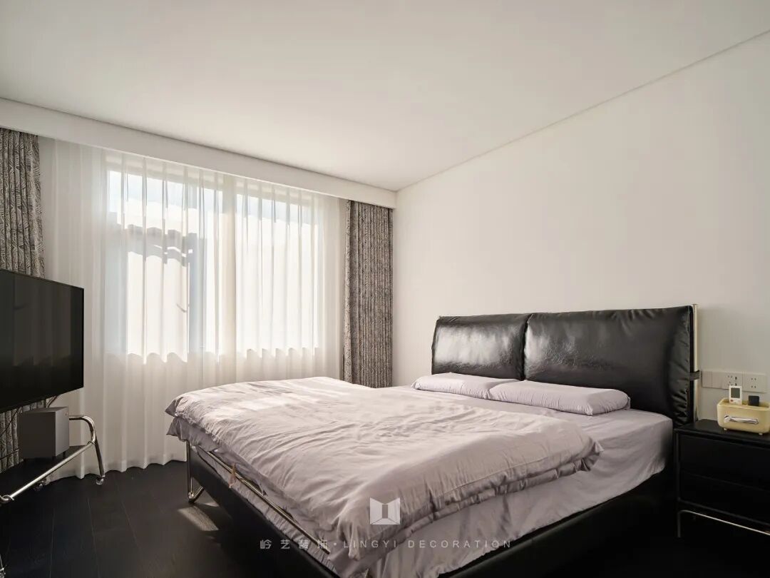 卧室的电视配置更是充满创意,设计师为其安装了一个移动支架。这种设计极大地增加了使用的灵活性,而且无需在墙上打孔挂电视,为墙面留出了更多的可能性。如果后期柜子不够用,还可以增加储藏空间,让房间的功能更加多样化,真正做到了根据居住者的需求进行设计。